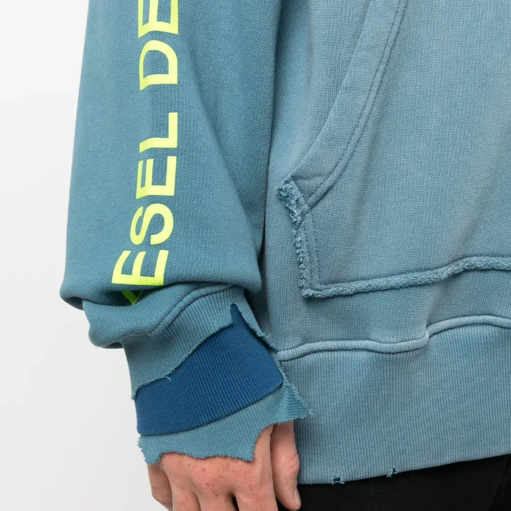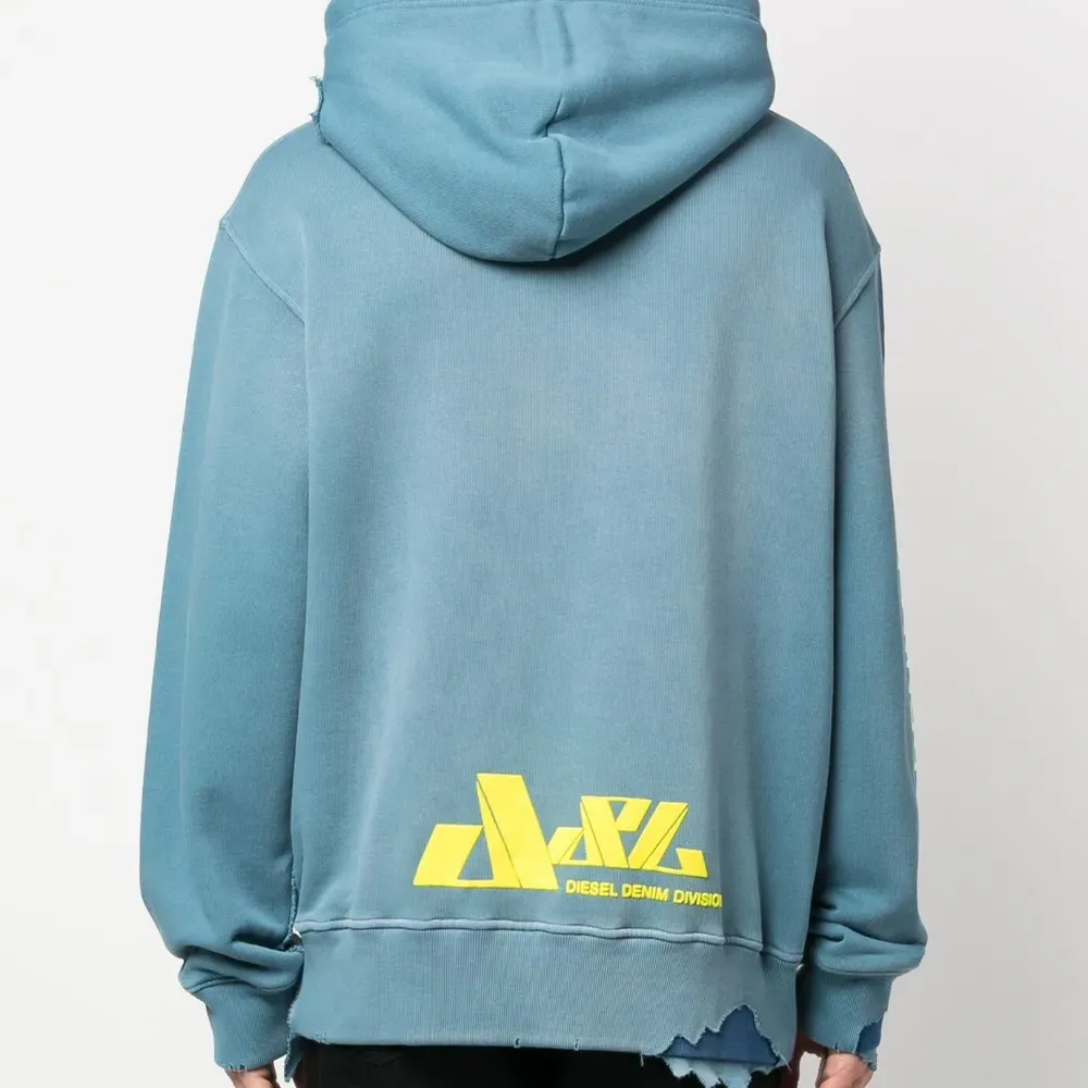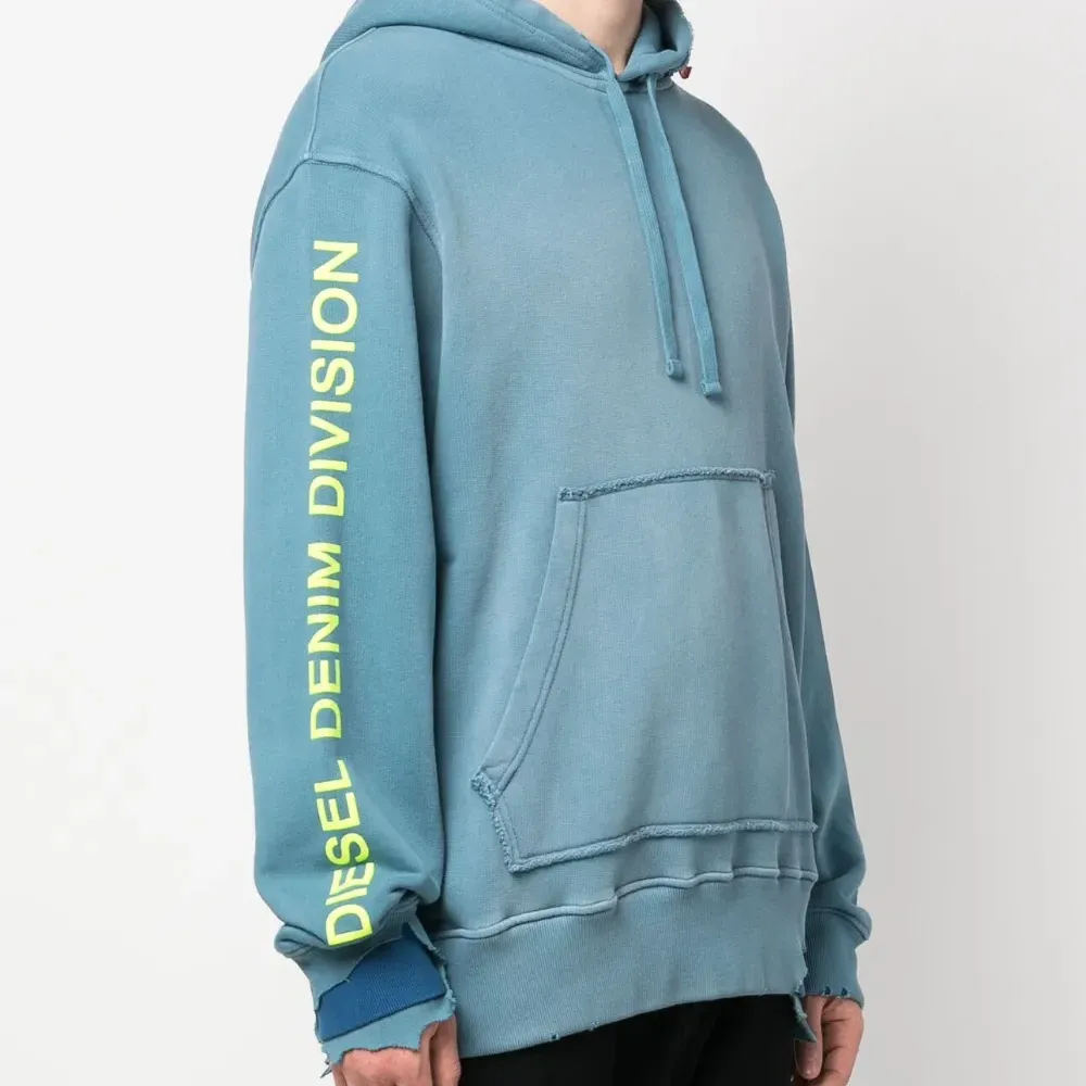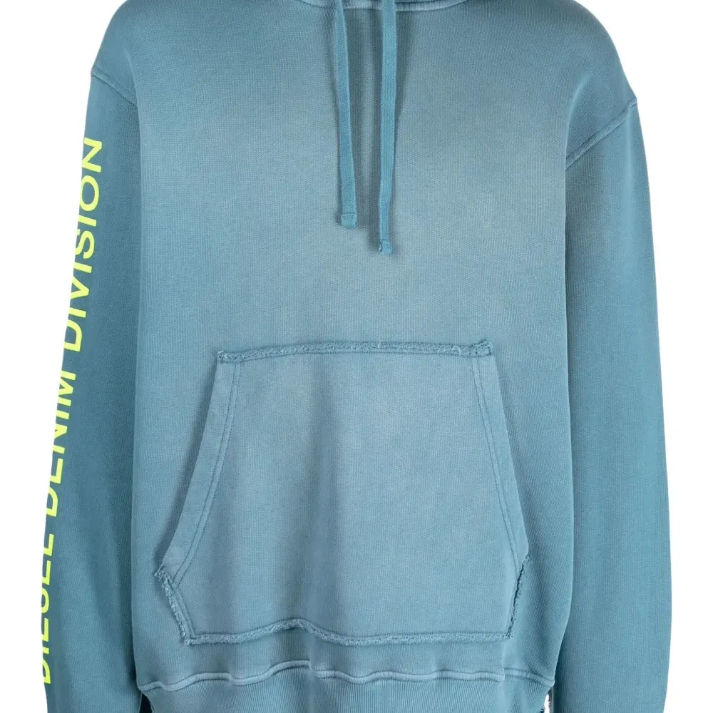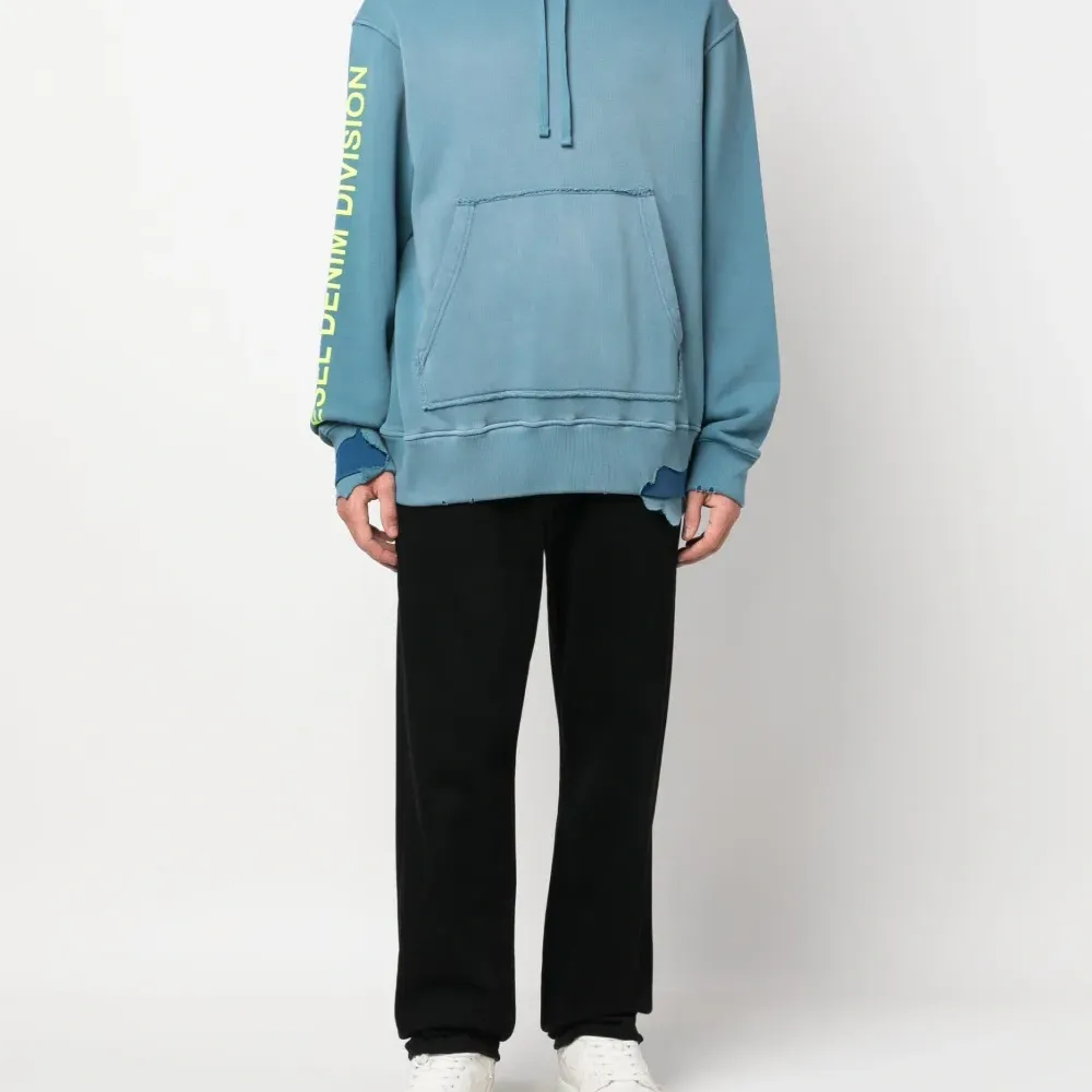 Синий, хлопок, модель с прорезями, принт с логотипом на рукаве, затягивающийся на шнурок капюшон, карман-муфта, длинные рукава, эластичные манжеты и прямой подол.
