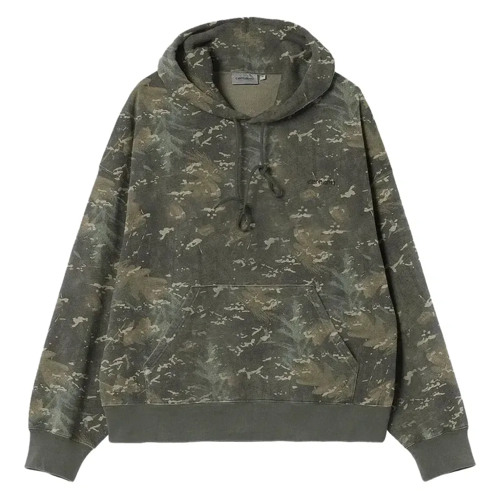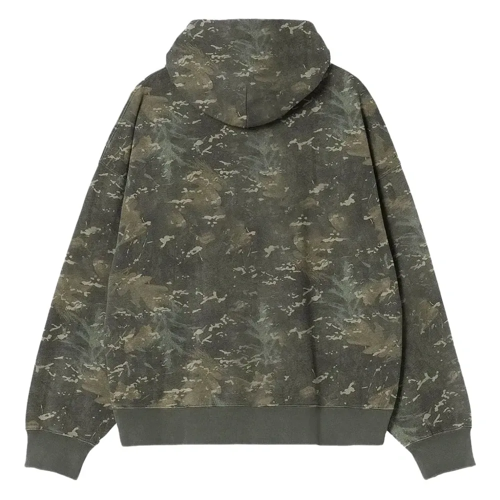 зелёный камуфляжный принт, капюшон на завязках, карман-кенгуру, ребристый низ, ребристые манжеты