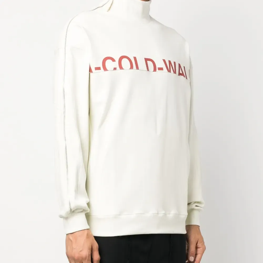 Кремовый, эластичный хлопок, воротник-труба, застежка на молнии сбоку, логотип спереди, длинные рукава, нашивка с логотипом сзади и прямой подол.