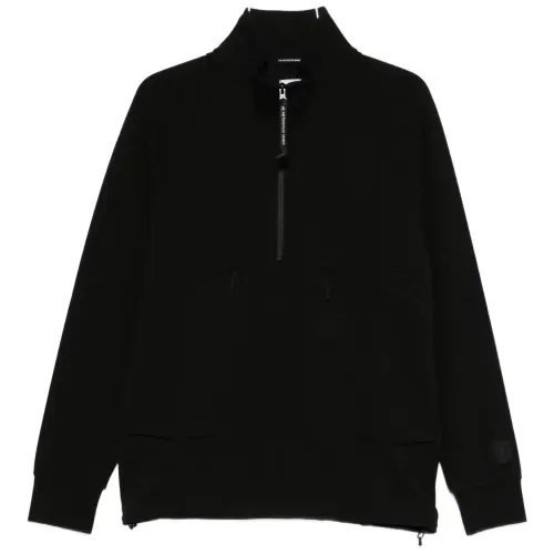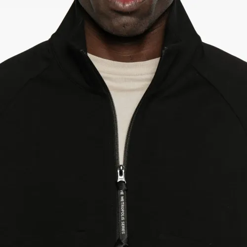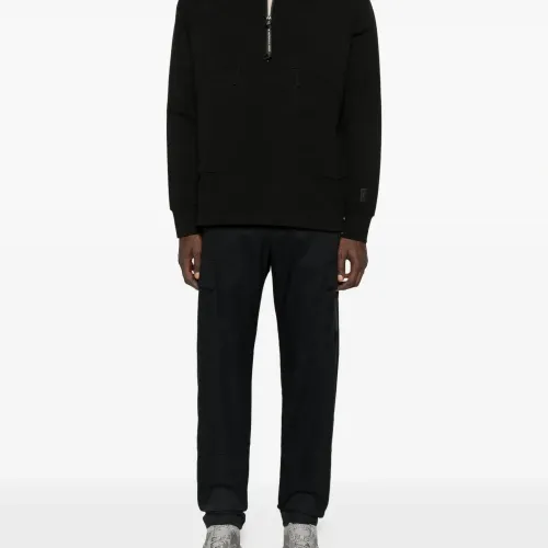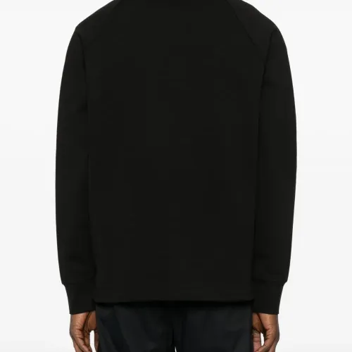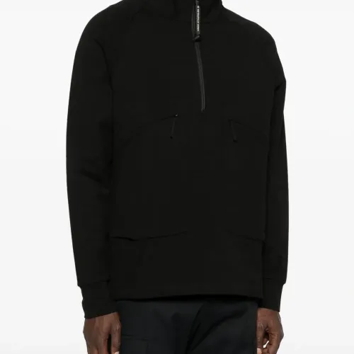 черная толстовка с наполовину застегивающейся молнией, накладными карманами, длинными рукавами, высоким воротником и изогнутым подолом
