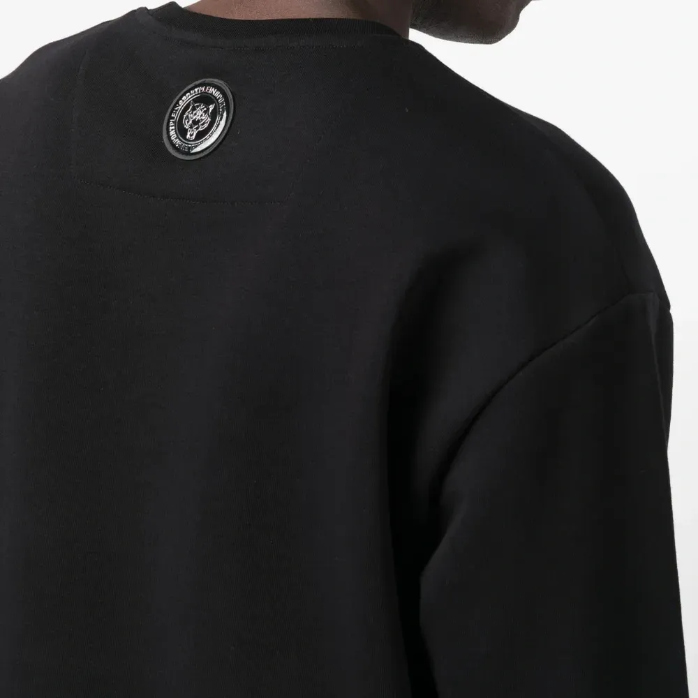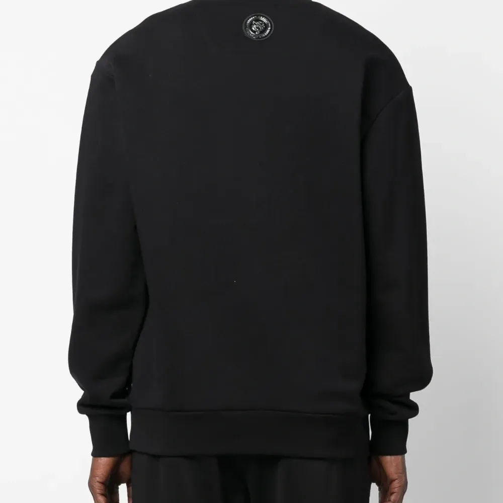 Логотип спереди, нашивка с логотипом сзади, круглый вырез и длинные рукава.