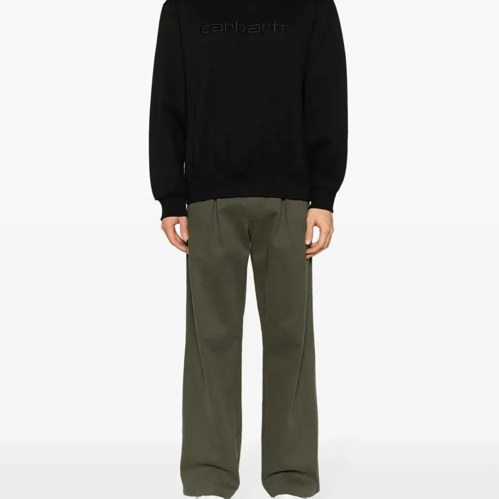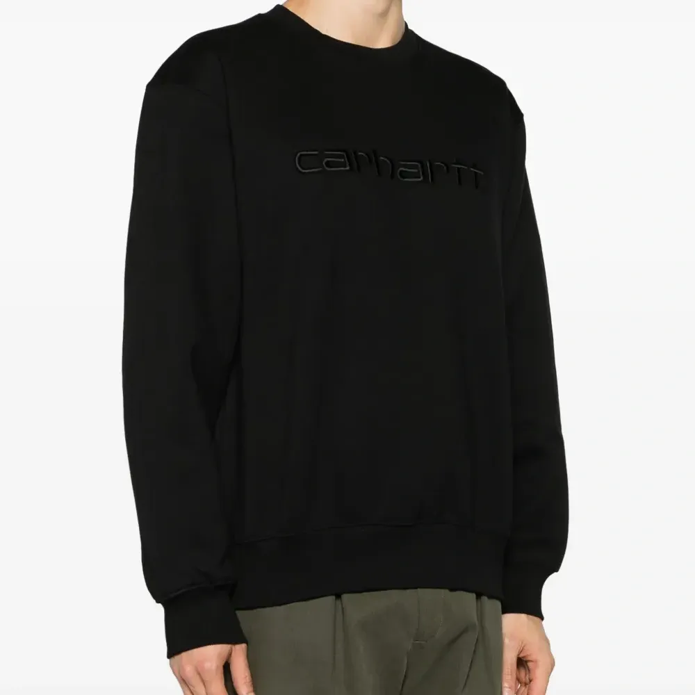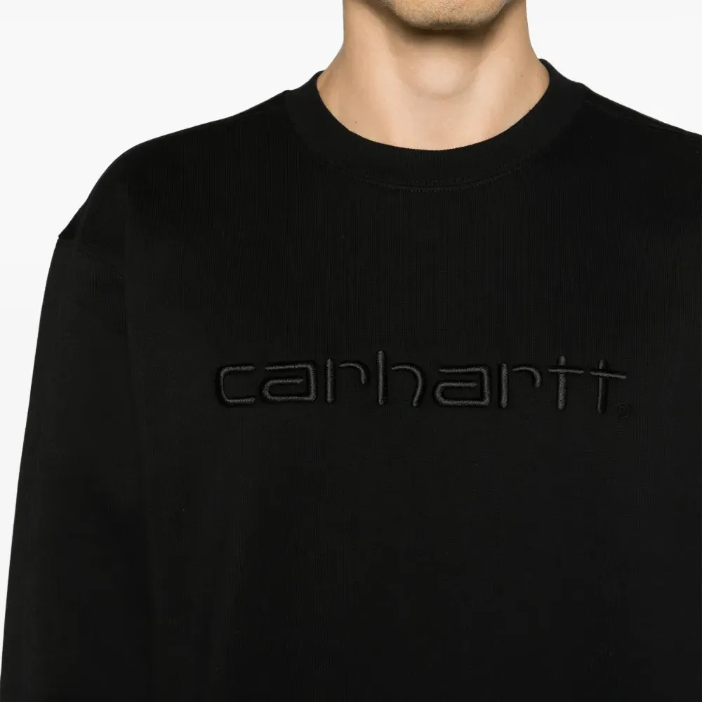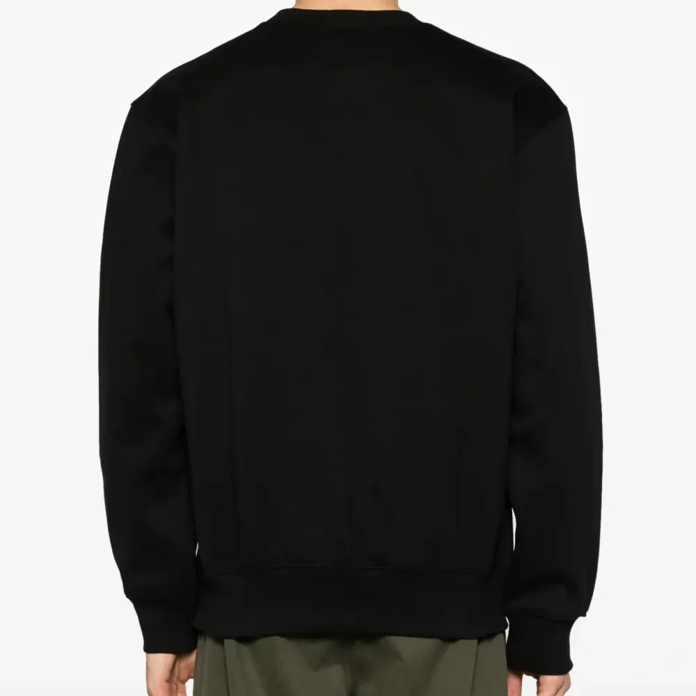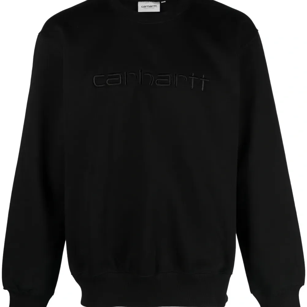 Черный, смесовый хлопок, вышитый логотип на груди, круглый вырез, приспущенные плечи, длинные рукава и прямой подол.