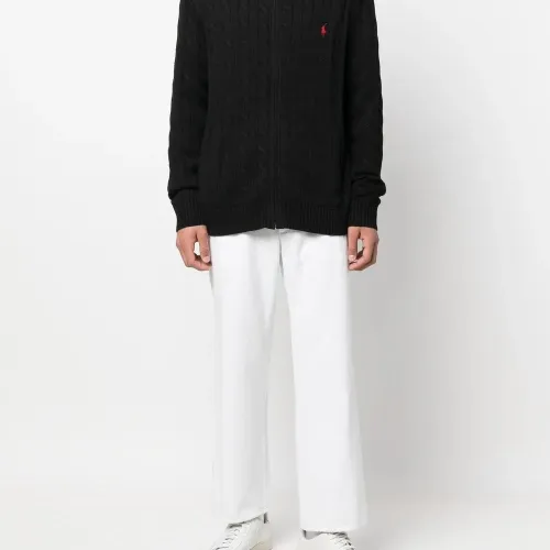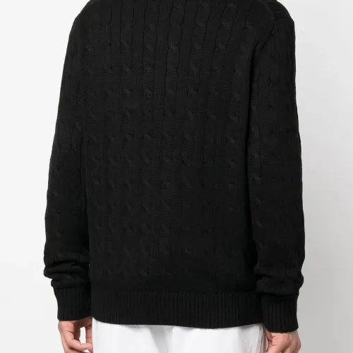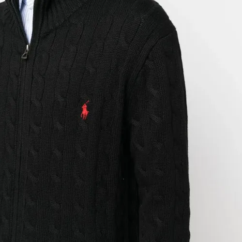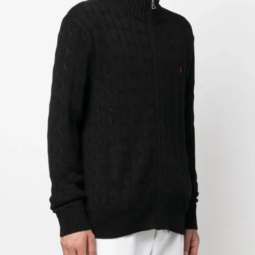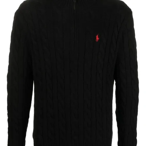 Черный/красный, хлопок, фактурная вязка, высокий воротник, короткая застежка на молнии спереди, вышитый логотип на груди, длинные рукава и края в рубчик.