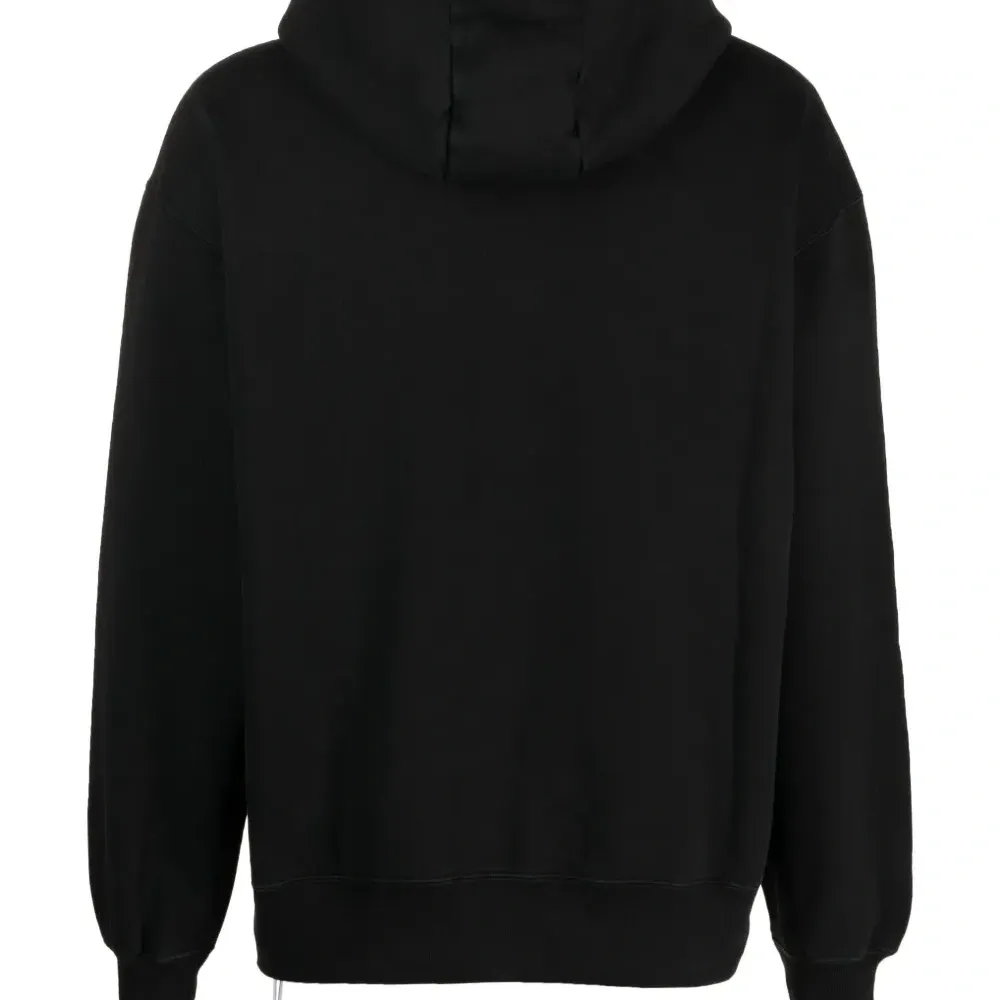 Черный, хлопок, логотип спереди, затягивающийся на шнурок капюшон, карман-муфта, длинные рукава и подол с кулиской.