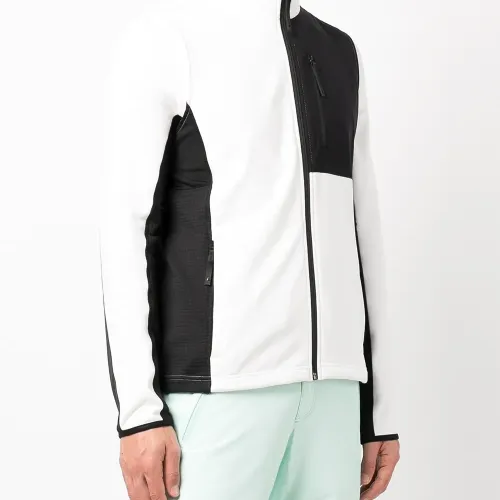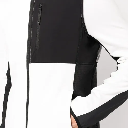Стиль колор-блок, два вшитых кармана по бокам, карман на молнии спереди, застежка на молнии спереди, длинные рукава и прямой подол.