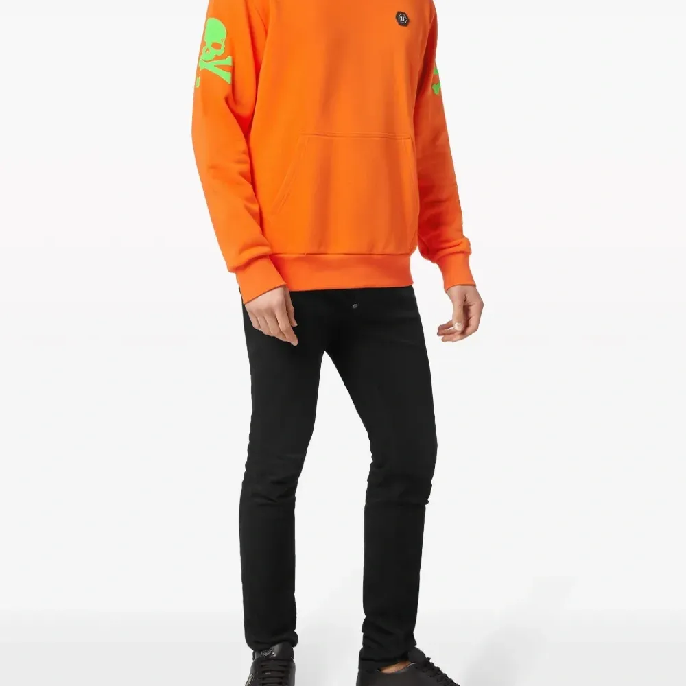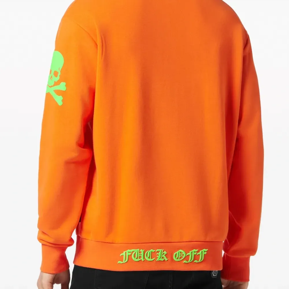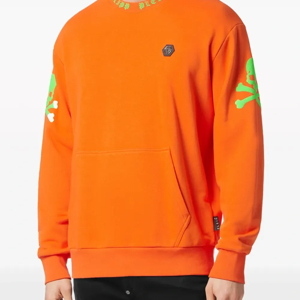 Морковный, светло-зеленый, смесовый хлопок, графичный принт спереди, принт с изображением черепа, нашивка с логотипом спереди, круглый вырез, длинные рукава, рукава с узкими манжетами и прямой подол.