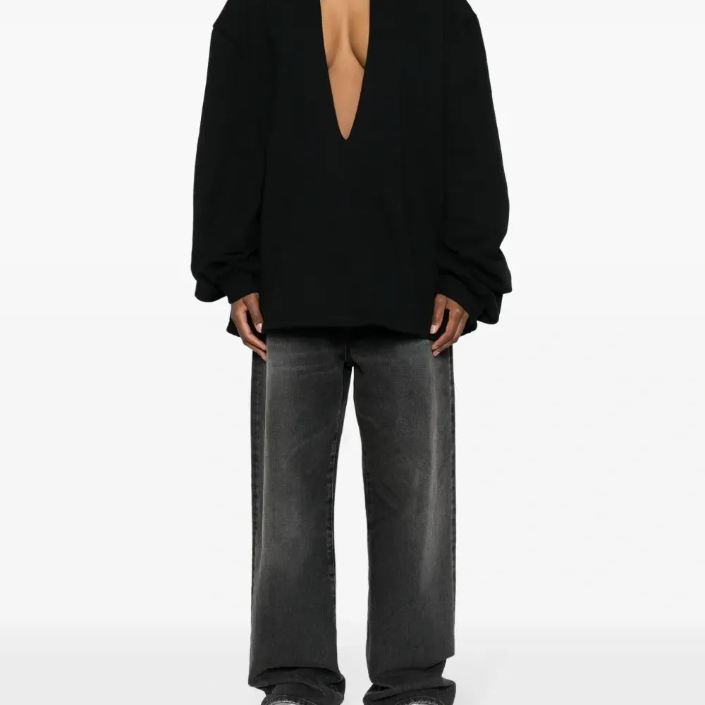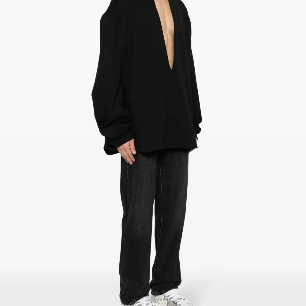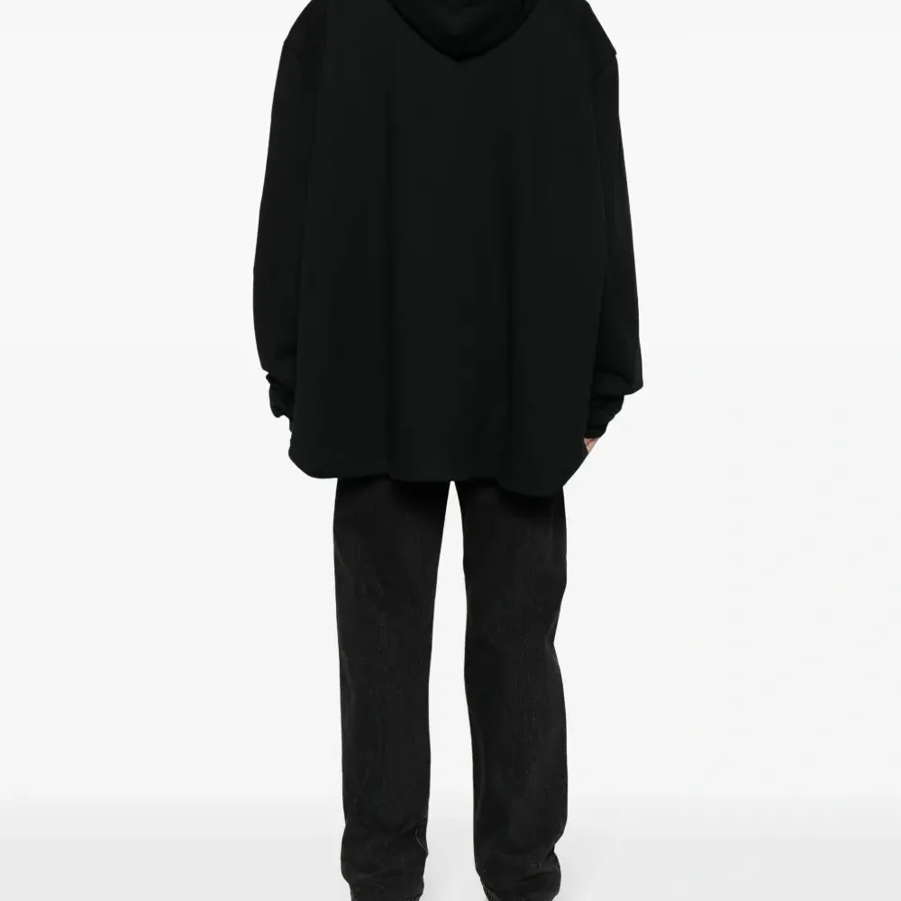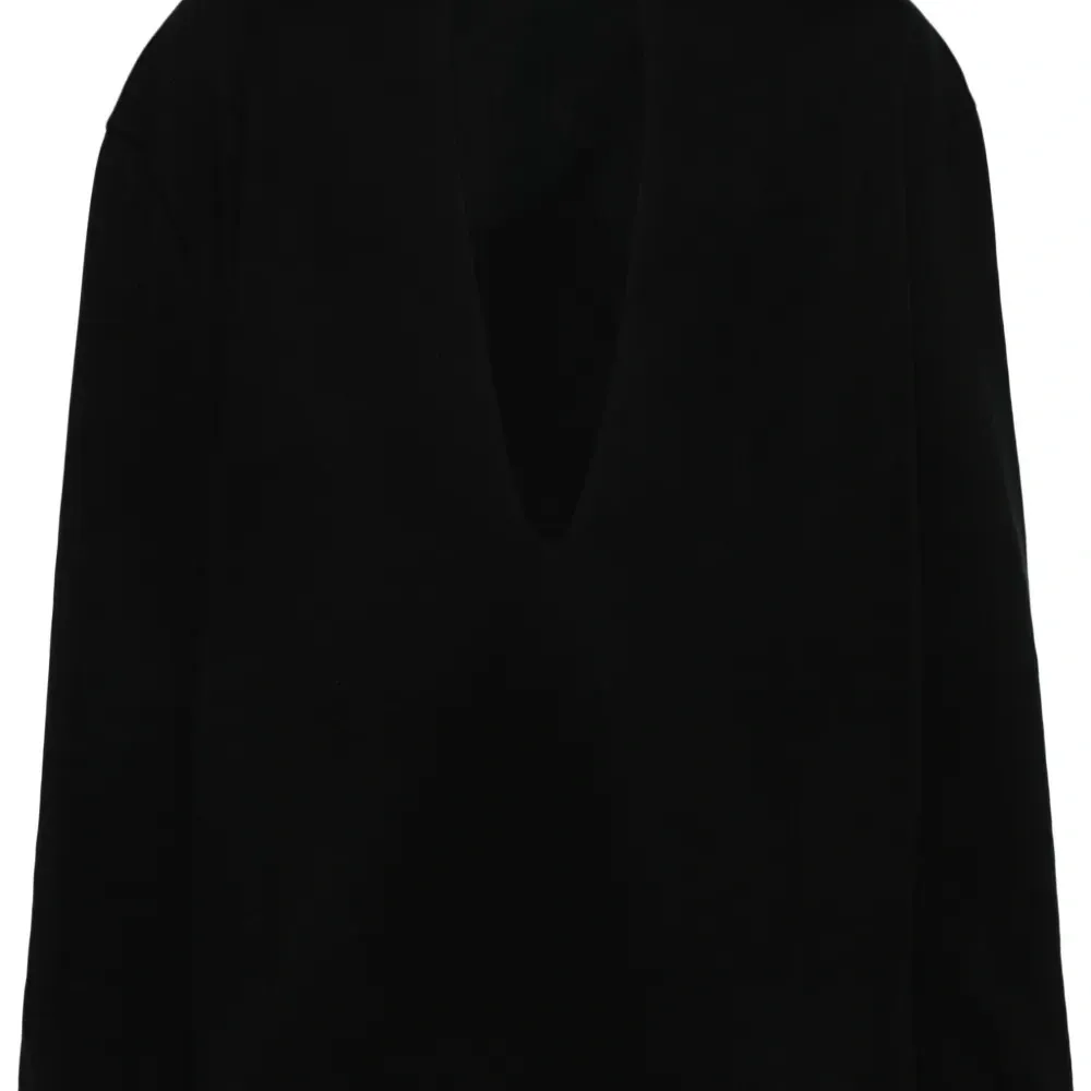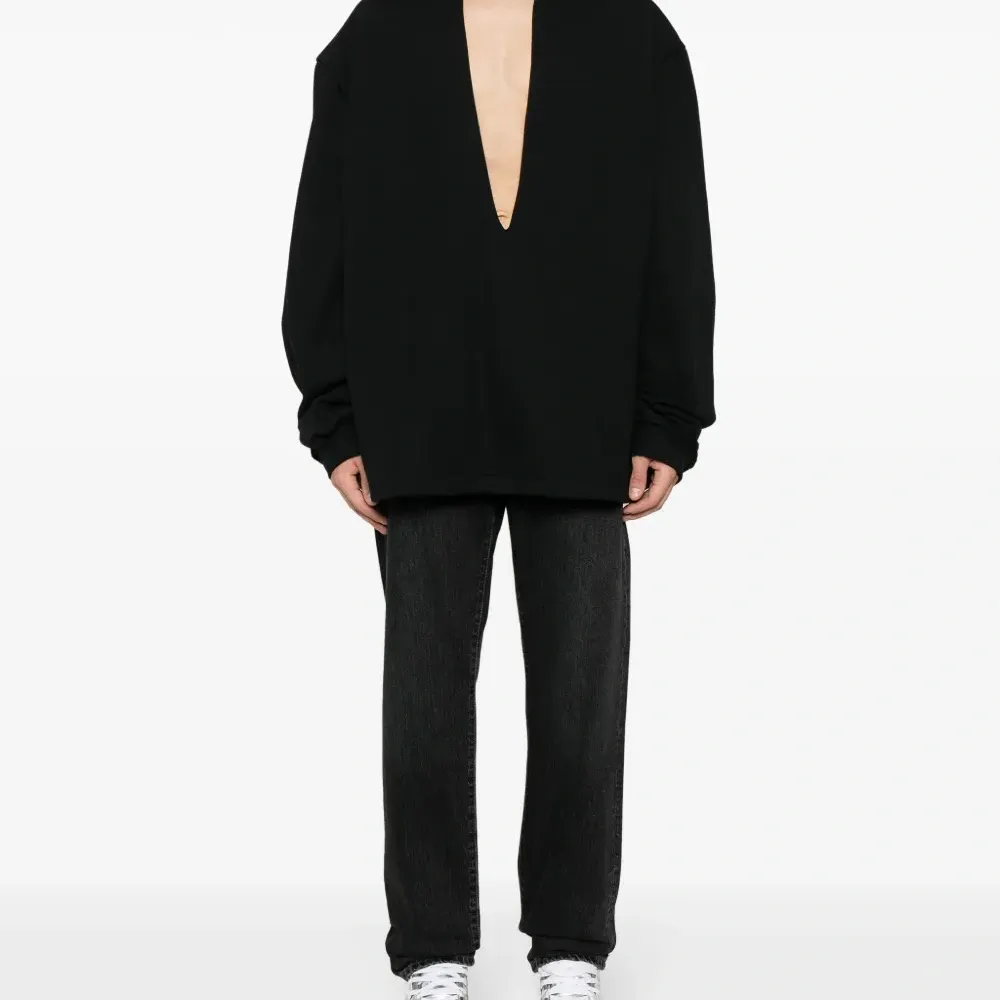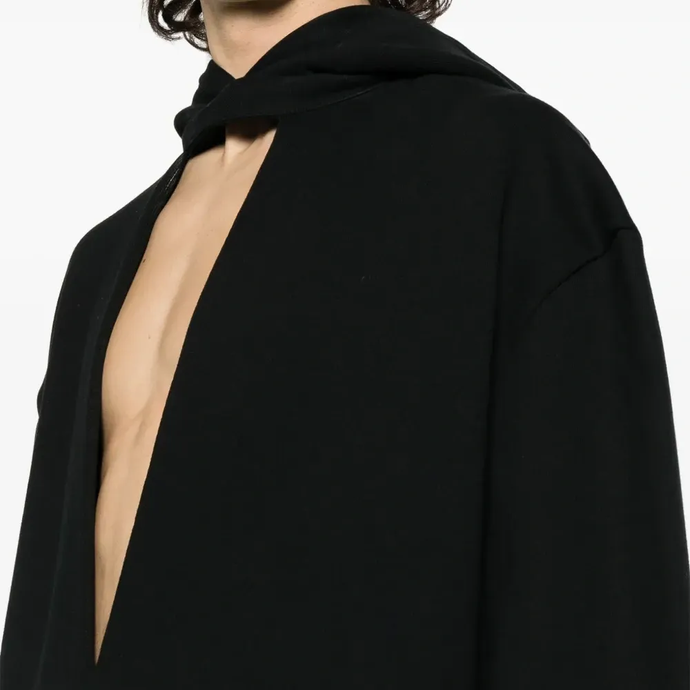Черный, хлопок, вырезные детали, глубокий V-образный вырез, классический капюшон, удлиненные рукава и прямой подол.