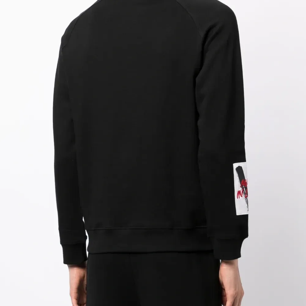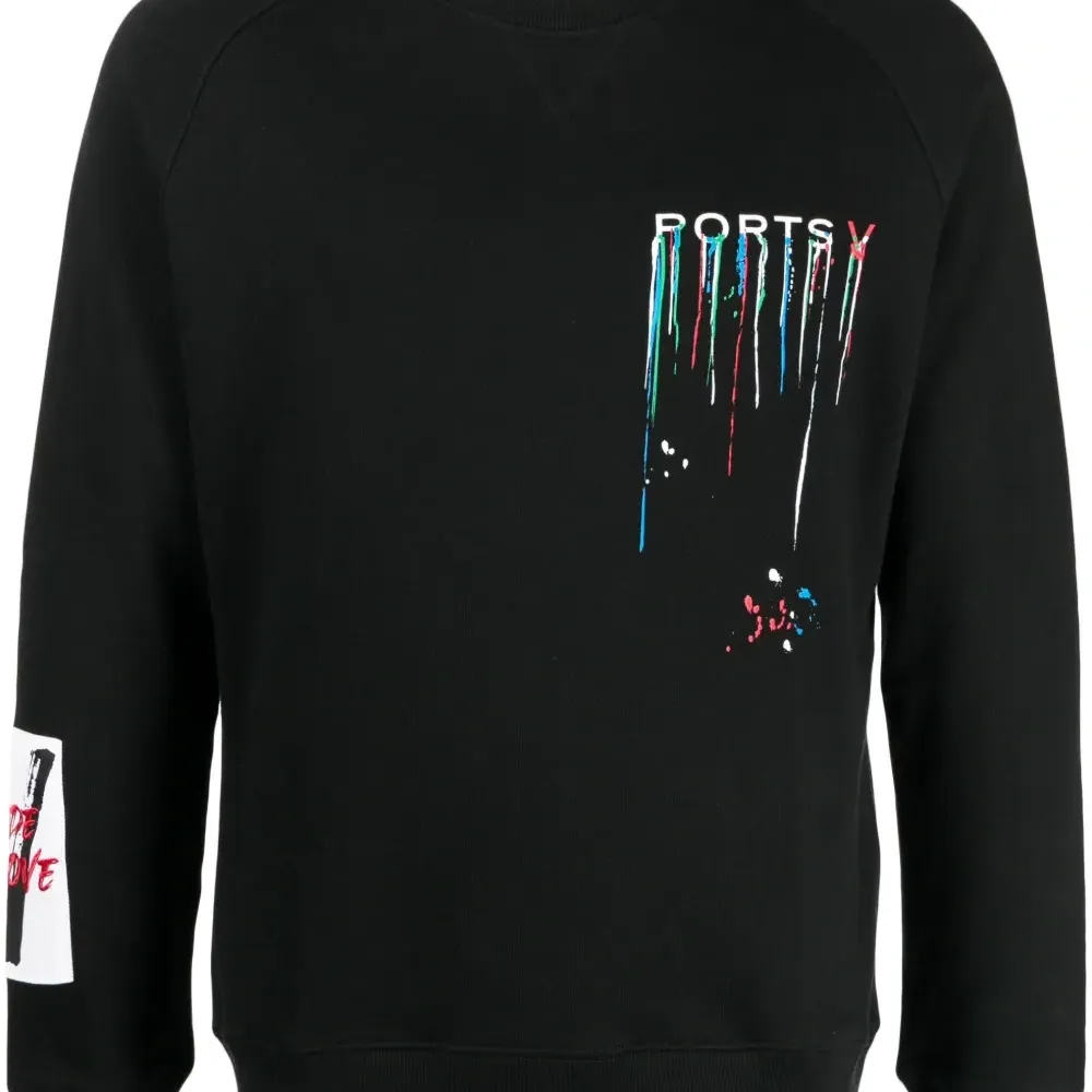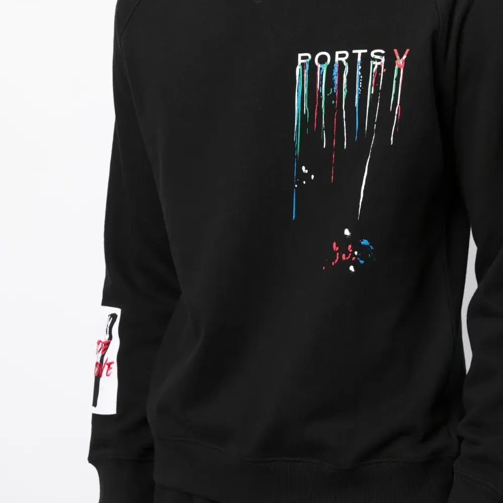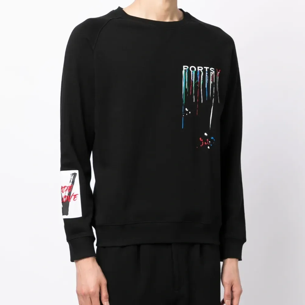 Черный, хлопок, принт с логотипом на груди, вышитый логотип на рукаве, эффект разбрызганной краски, круглый вырез, длинные рукава и прямой подол.