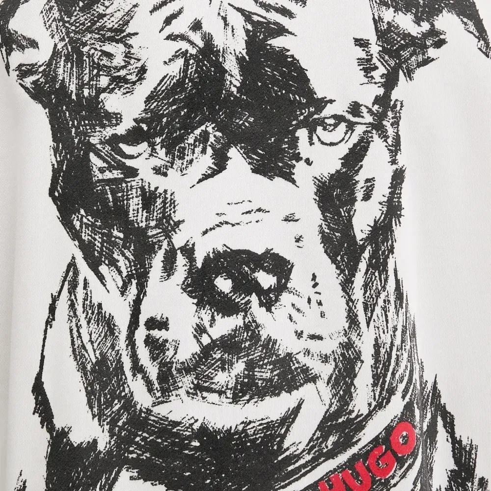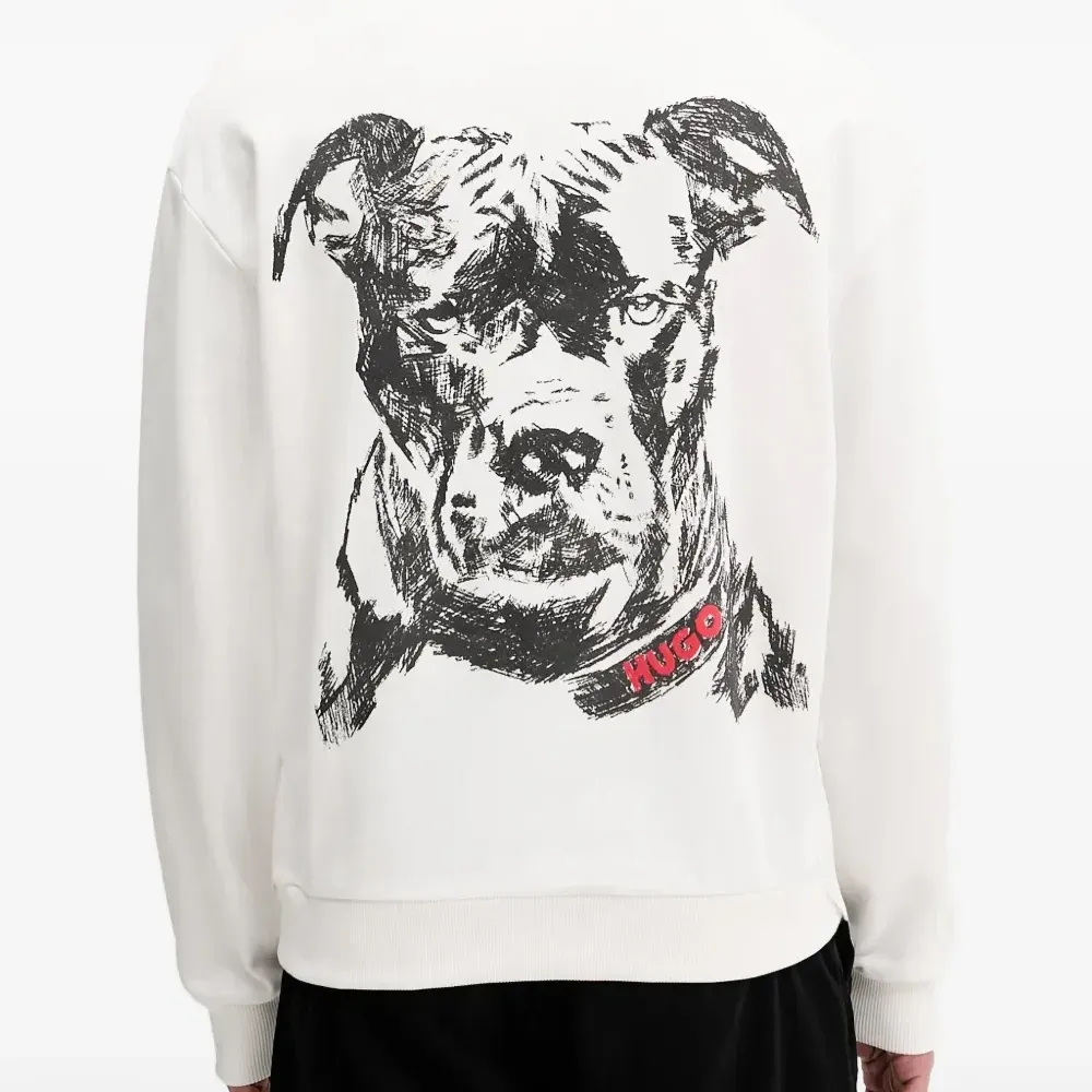 белый свитшот с круглым вырезом, принтом собаки, длинными рукавами, ребристыми манжетами и нижним краем