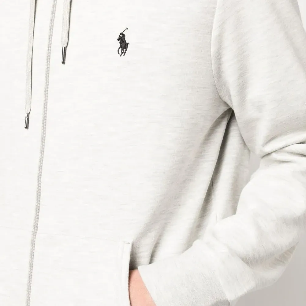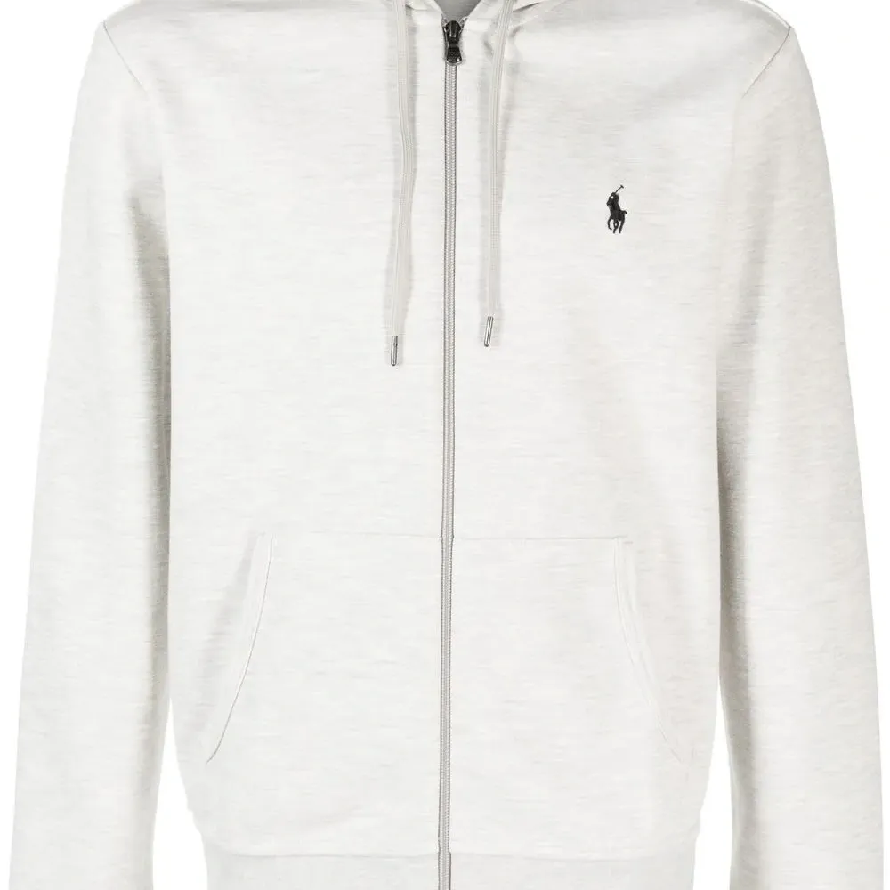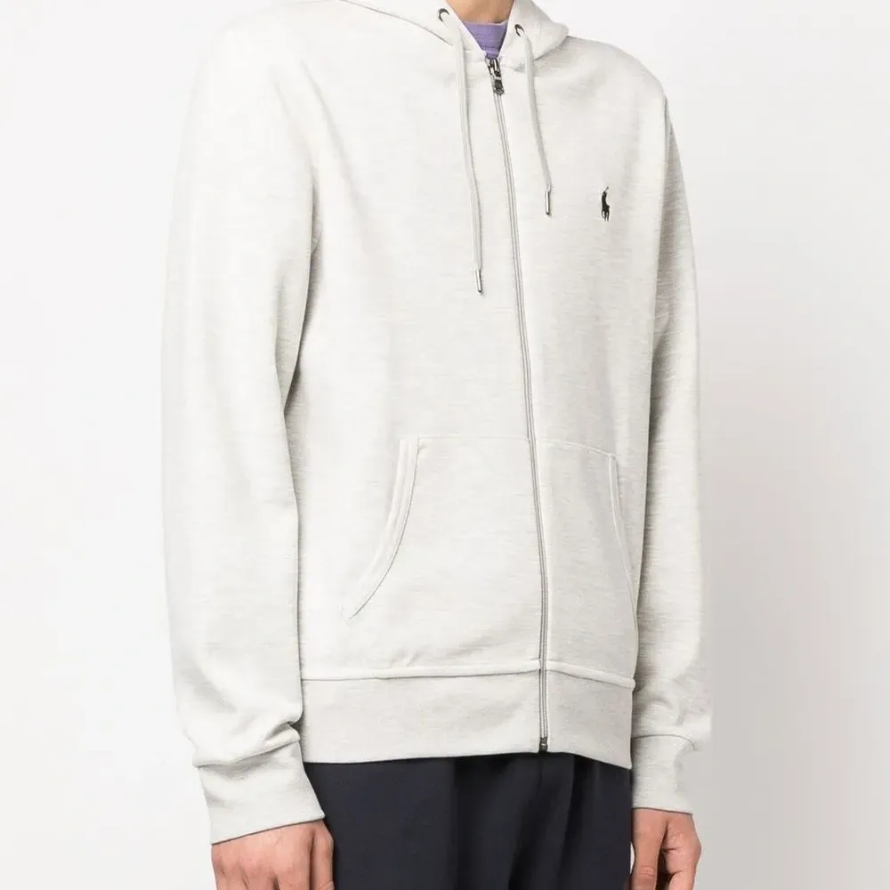 Светло-серый, смесовый хлопок, вышитый логотип на груди, затягивающийся на шнурок капюшон, длинные рукава и застежка на молнии спереди.