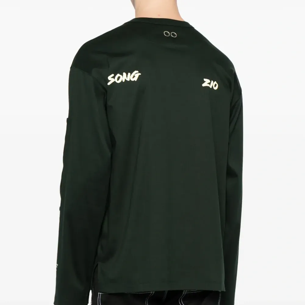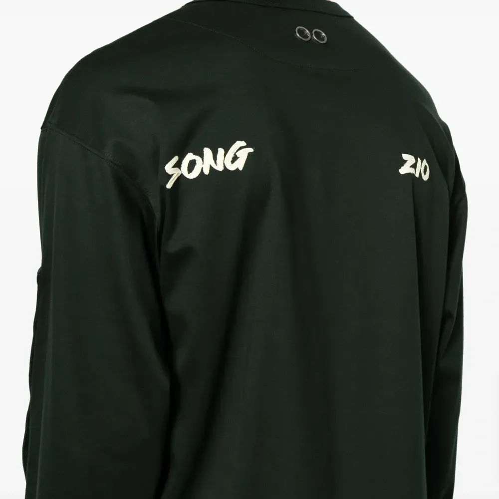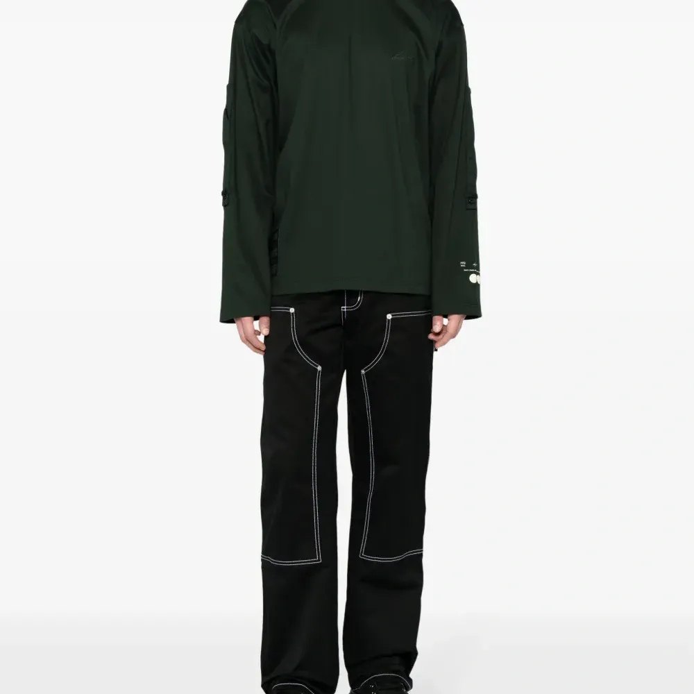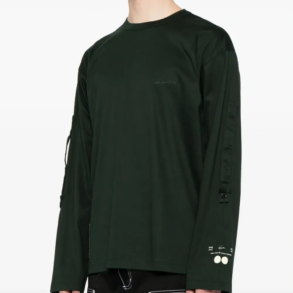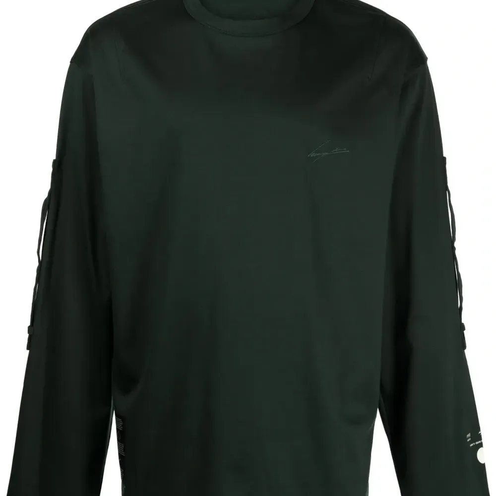 Вышитый логотип на груди, принт с логотипом сзади, люверсы, круглый вырез, приспущенные плечи, длинные рукава и прямой подол.