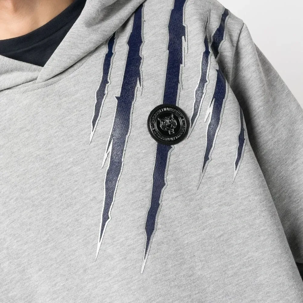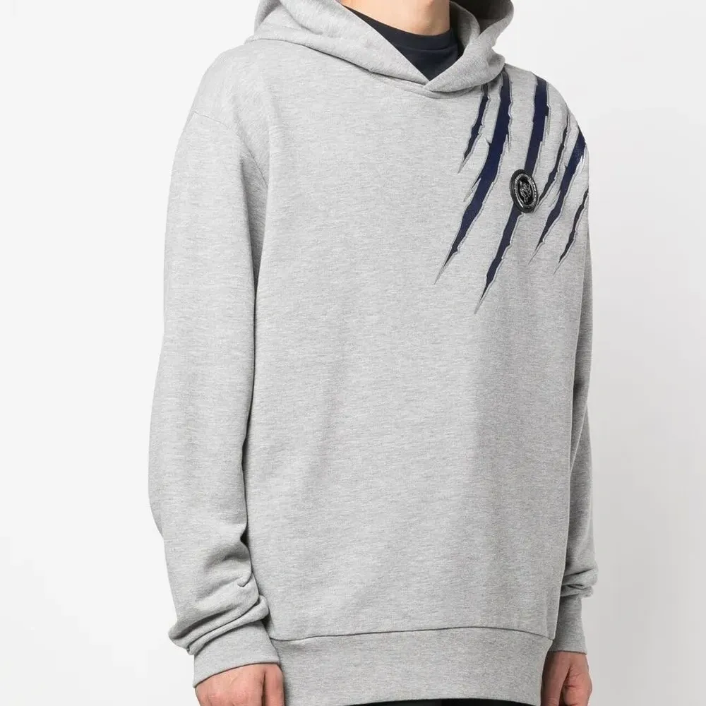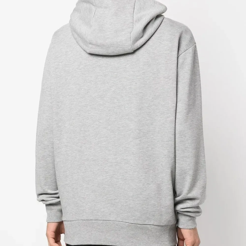 Нашивка с логотипом на груди, классический капюшон, длинные рукава и прямой подол.