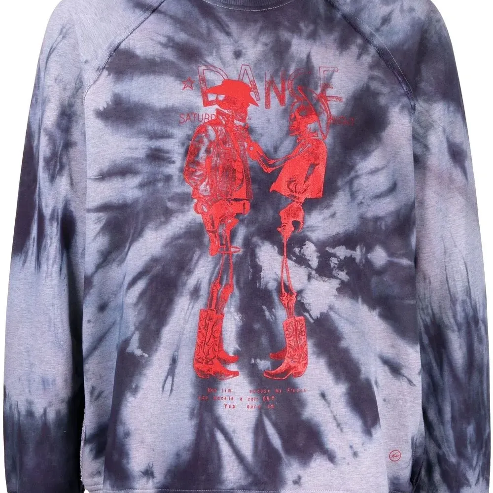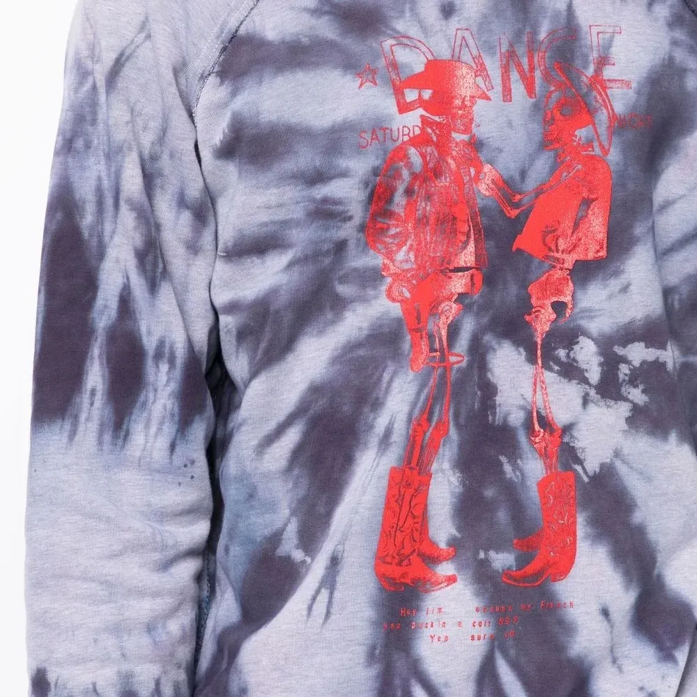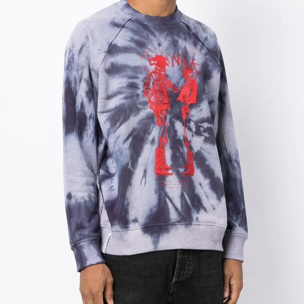Темно-синий, пудрово-голубой, кроваво-красный, хлопок, принт тай-дай, принт с изображением скелета, круглый вырез, рукава реглан, манжеты в рубчик и подол в рубчик.