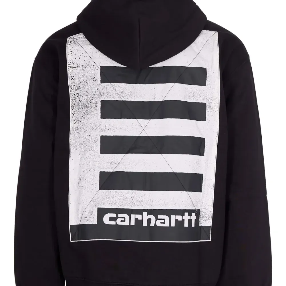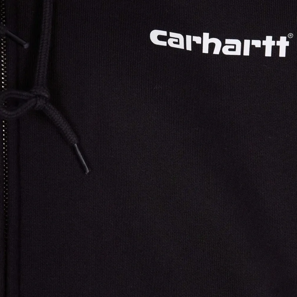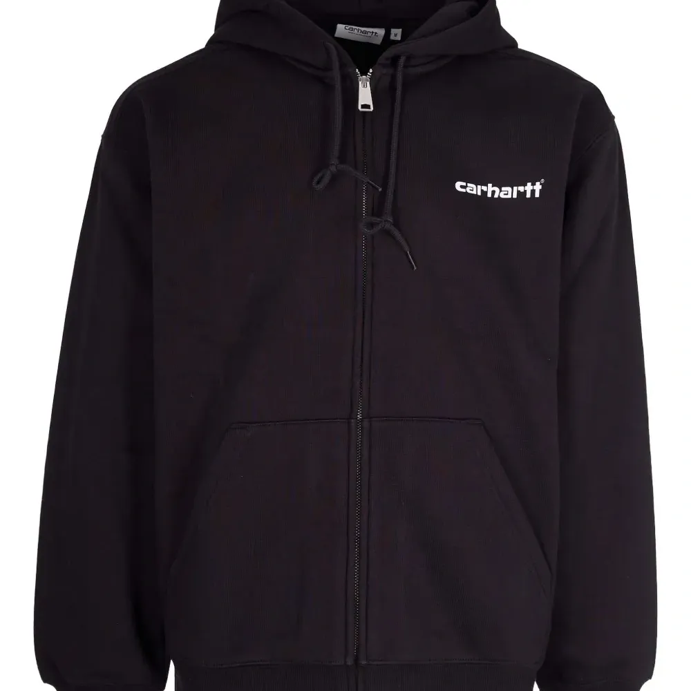 чёрный худи с логотипом, застёжкой-молнией, кулиской на капюшоне, передним карманом-кенгуру, ребристым нижним краем
