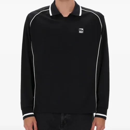 черная поло с нашивкой-логотипом, длинными рукавами, контрастной отделкой, воротником-поло и ребристыми манжетами