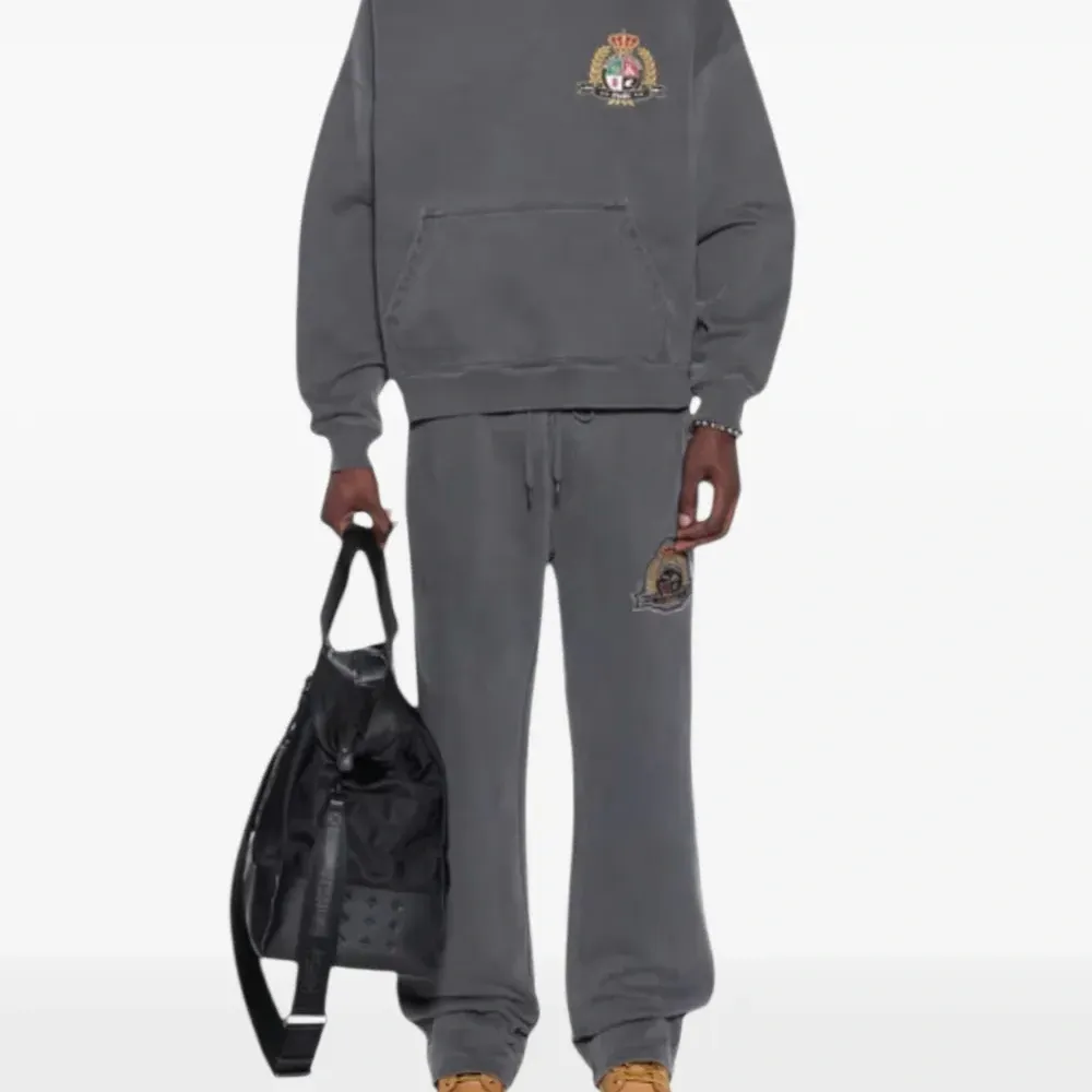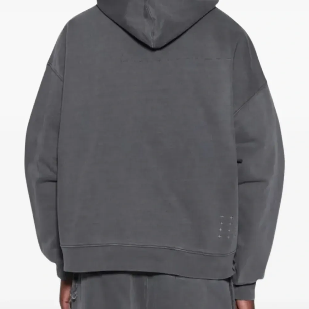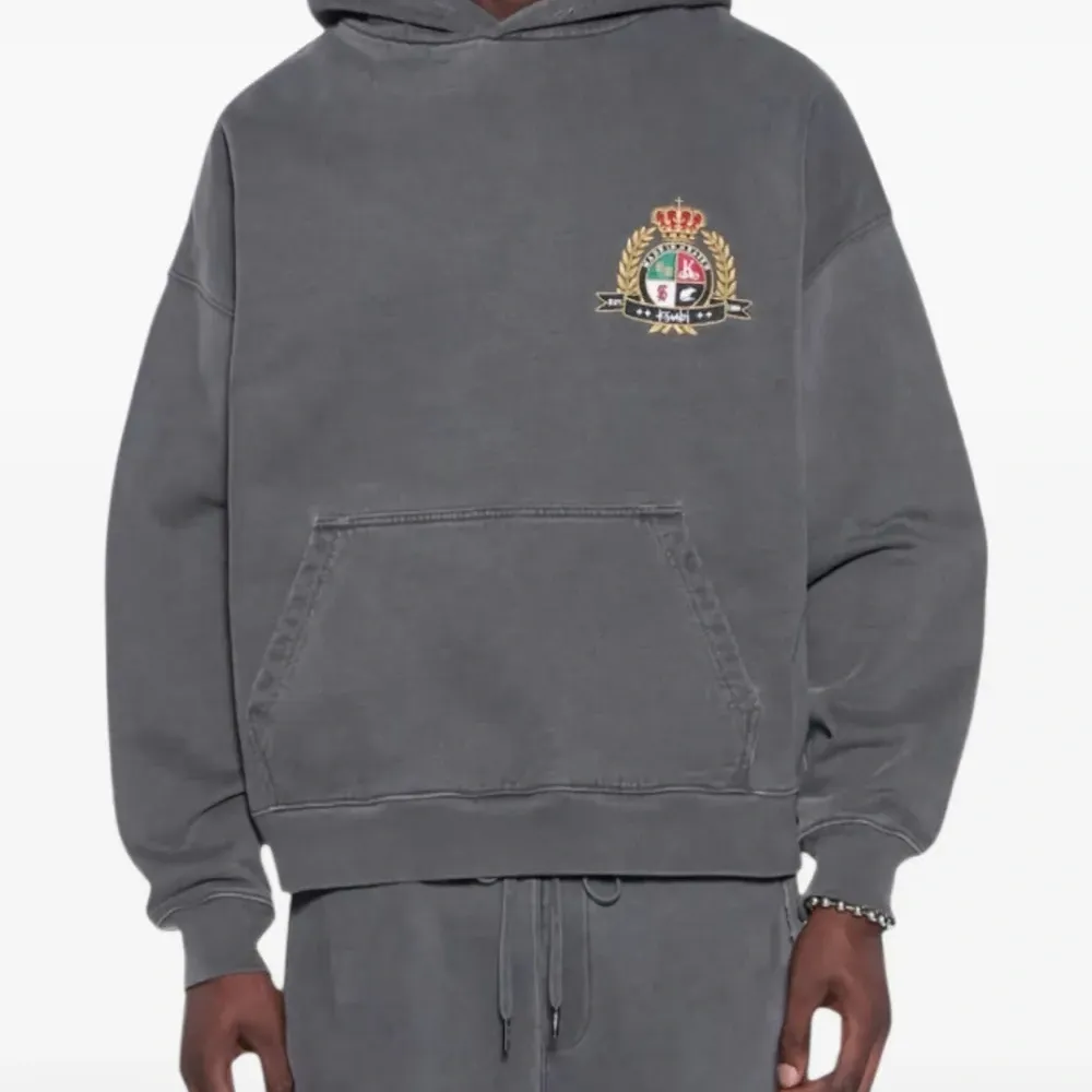 угольно-серое классическое худи с гербом, карманом-кенгуру и заниженными плечами