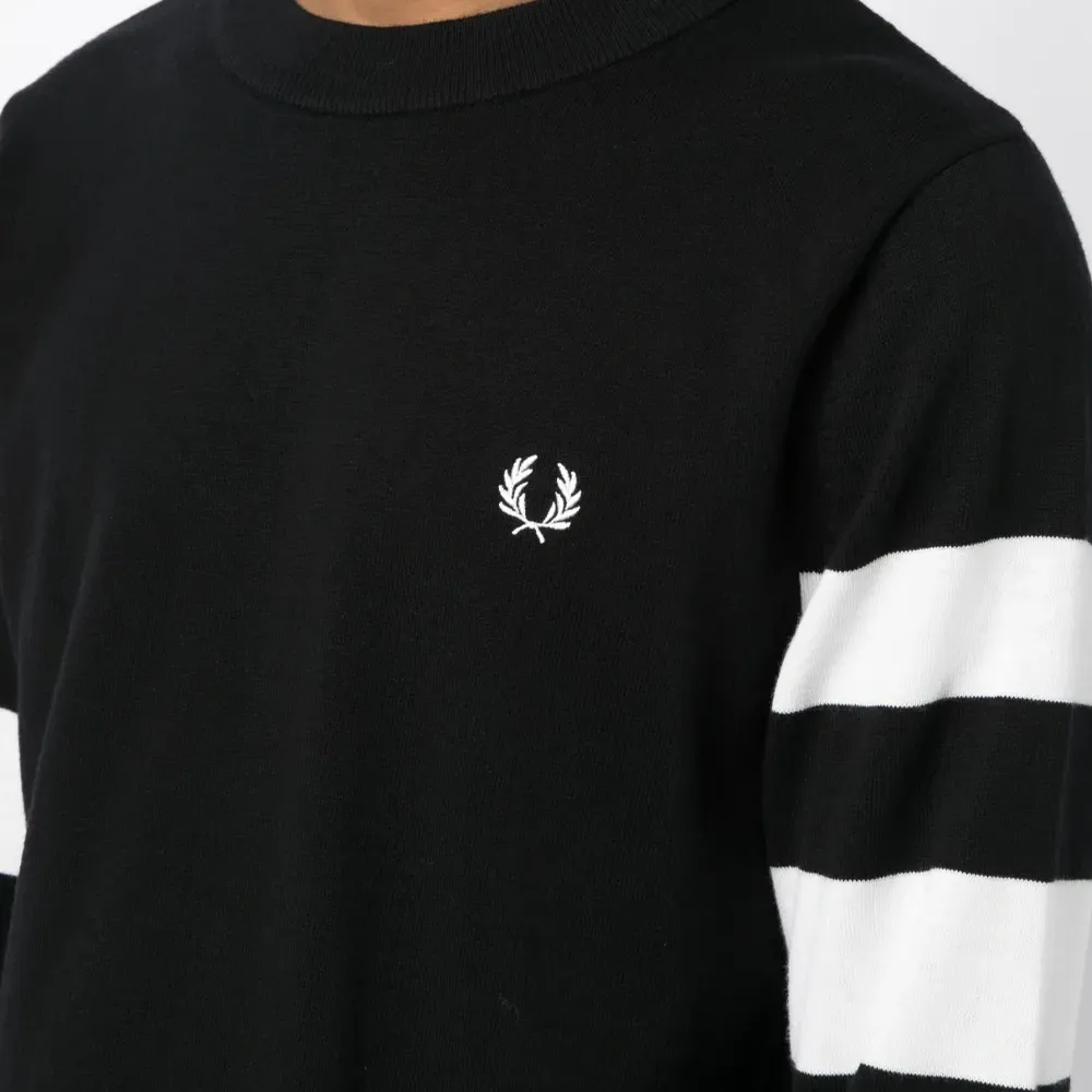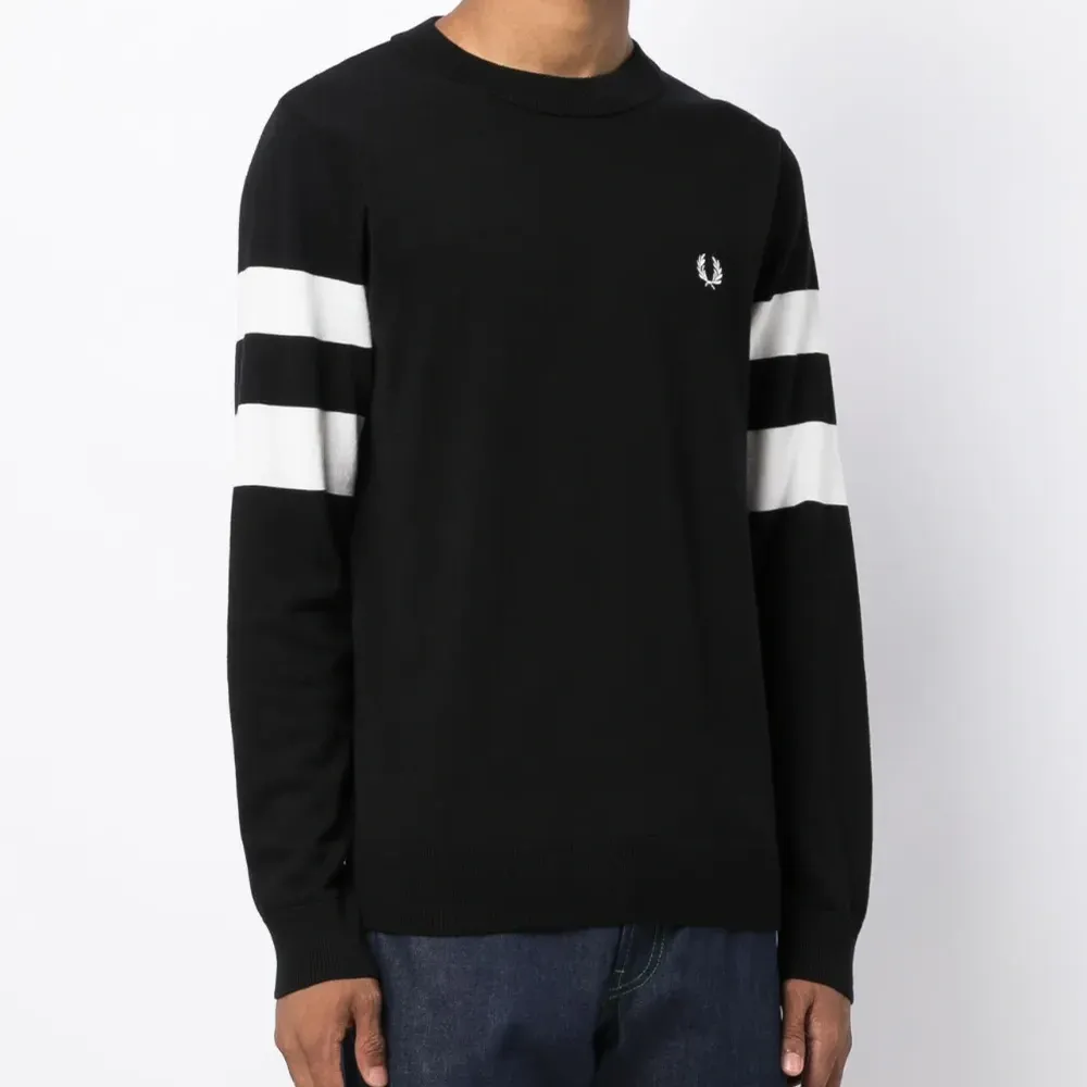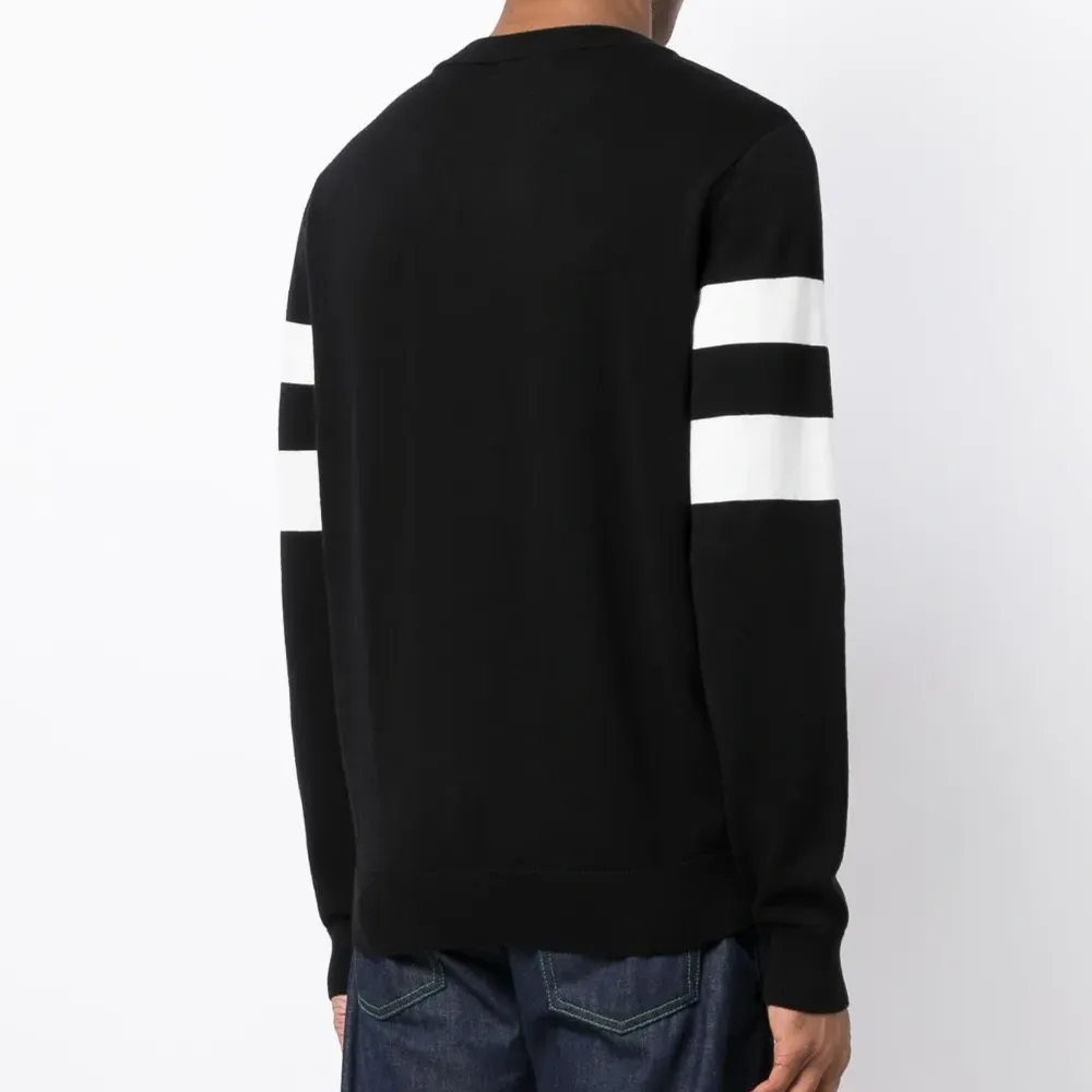 Черный/белый, смесь шерсти и хлопка, вышитый логотип на груди, полоска сбоку, круглый вырез, длинные рукава и прямой подол.