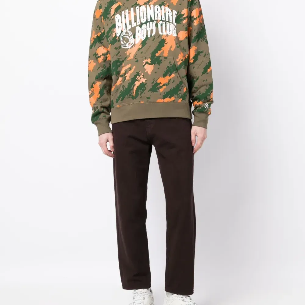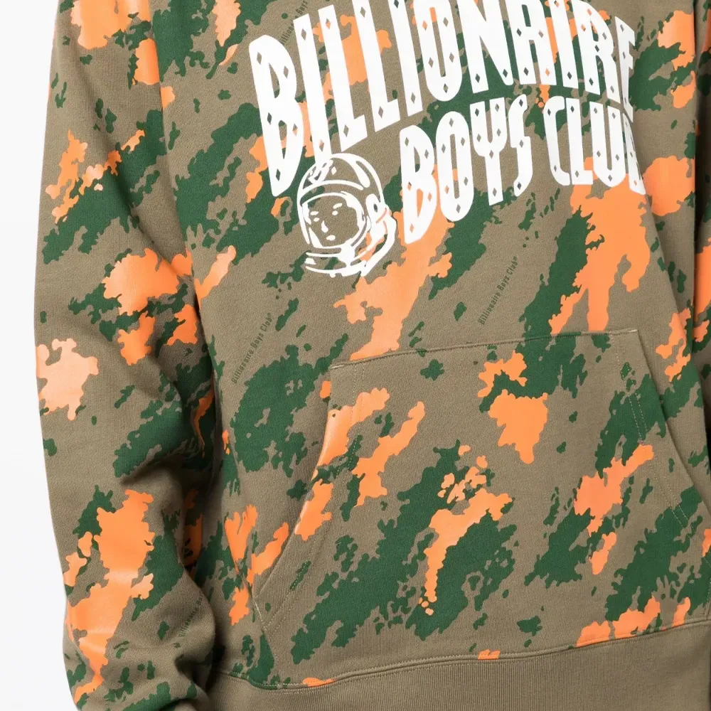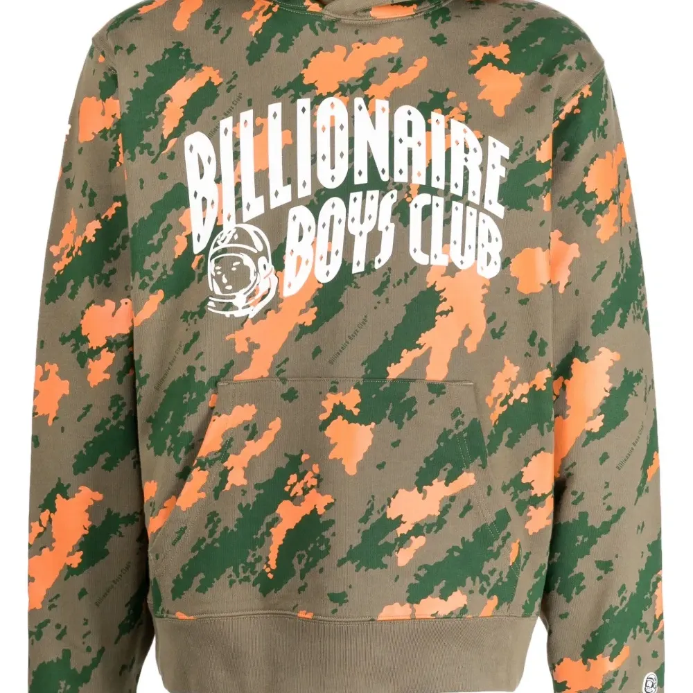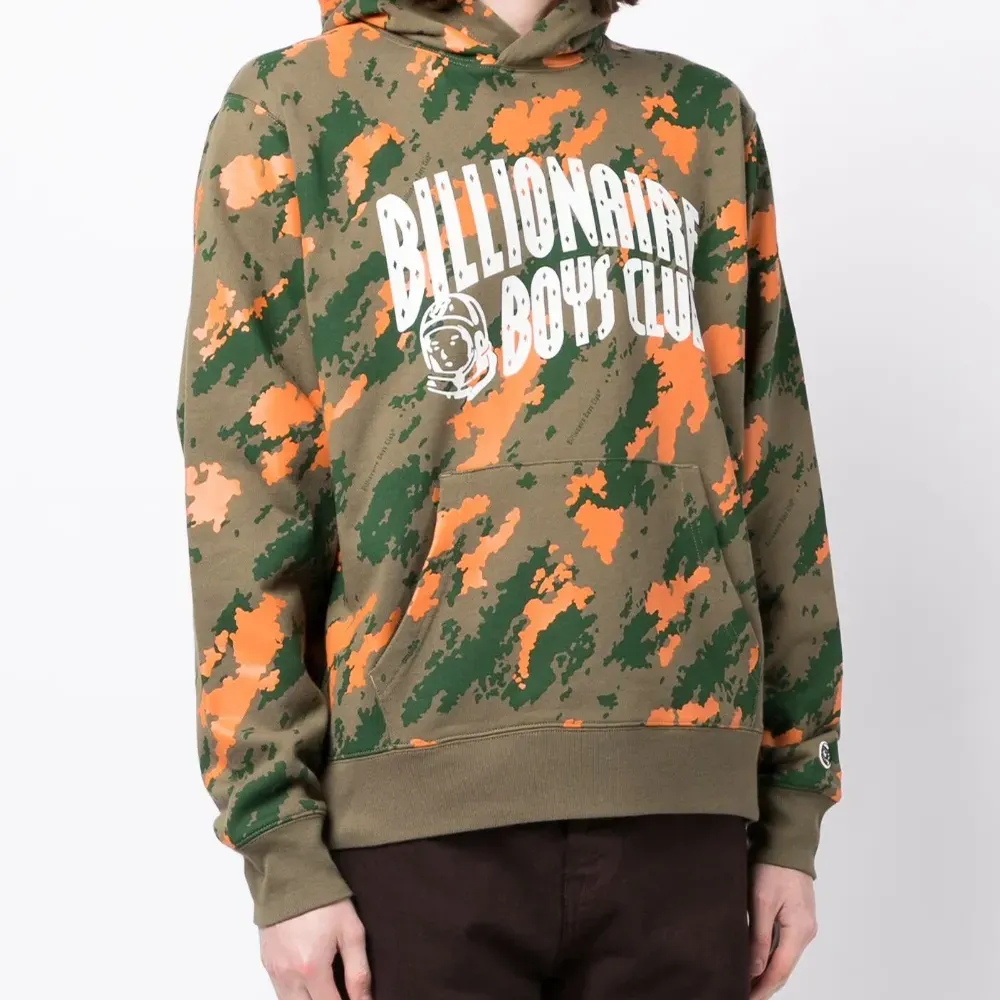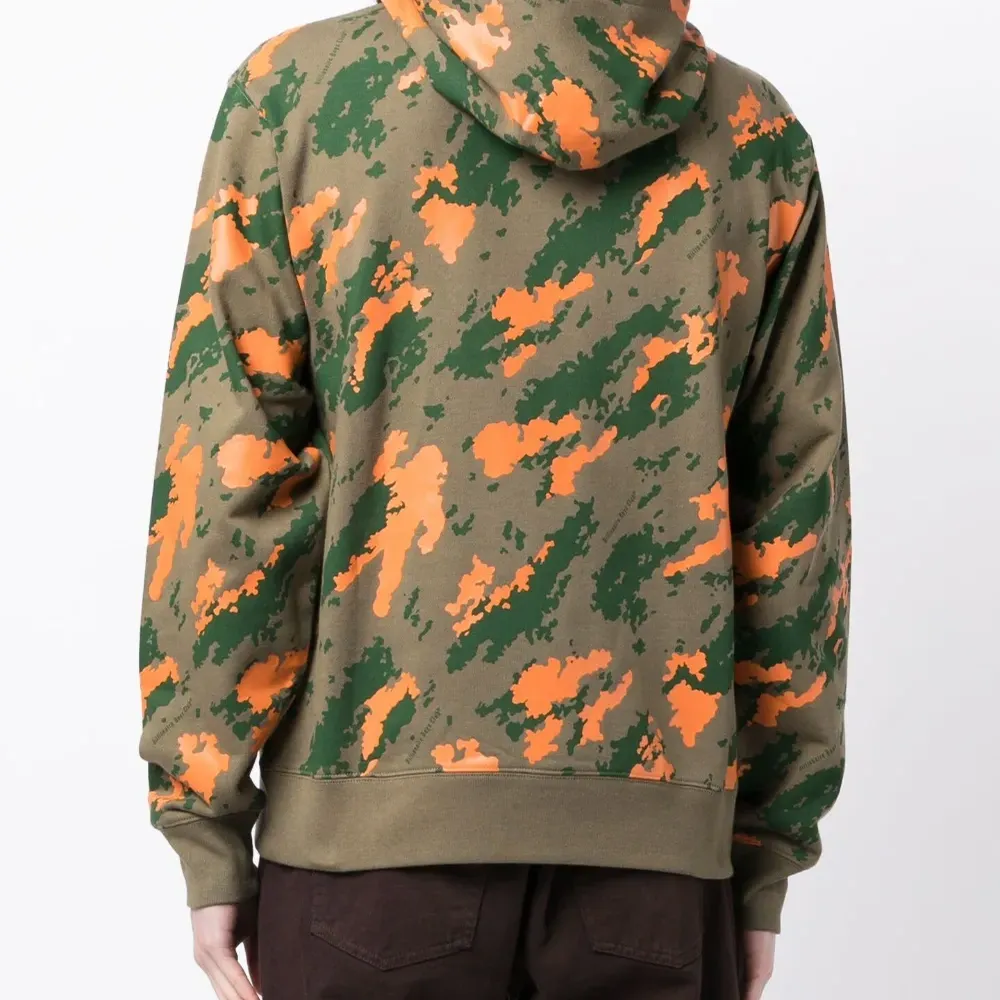 Хаки, зеленый, оранжевый, хлопок, камуфляжный принт, логотип спереди, классический капюшон, карман-муфта, рукава с узкими манжетами и прямой подол.