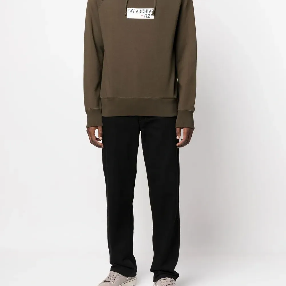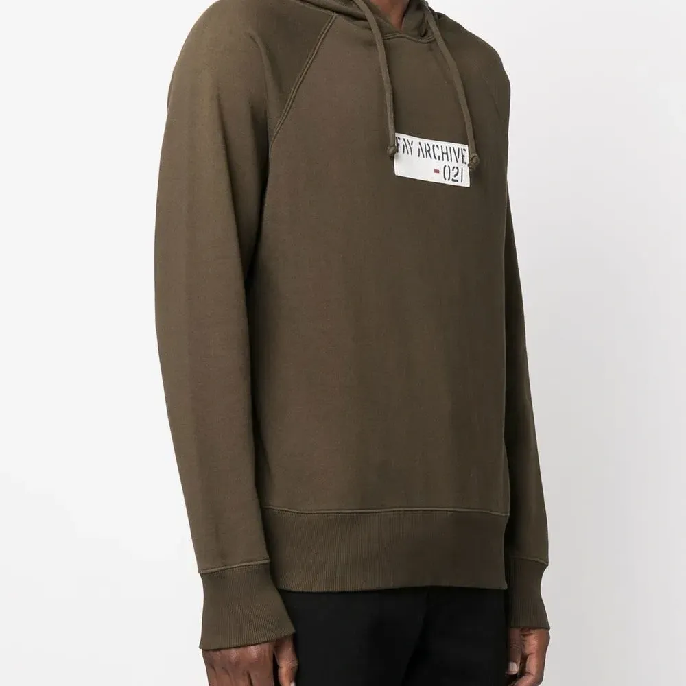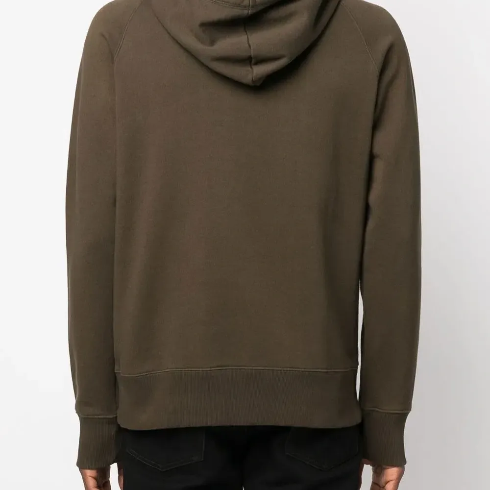 Оливково-зеленый, логотип спереди, затягивающийся на шнурок капюшон, манжеты в рубчик, подол в рубчик и длинные рукава.