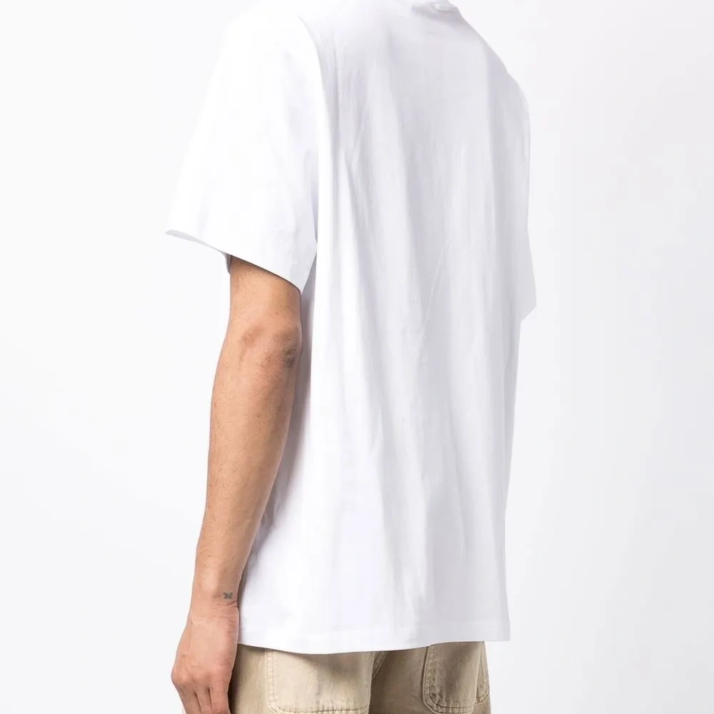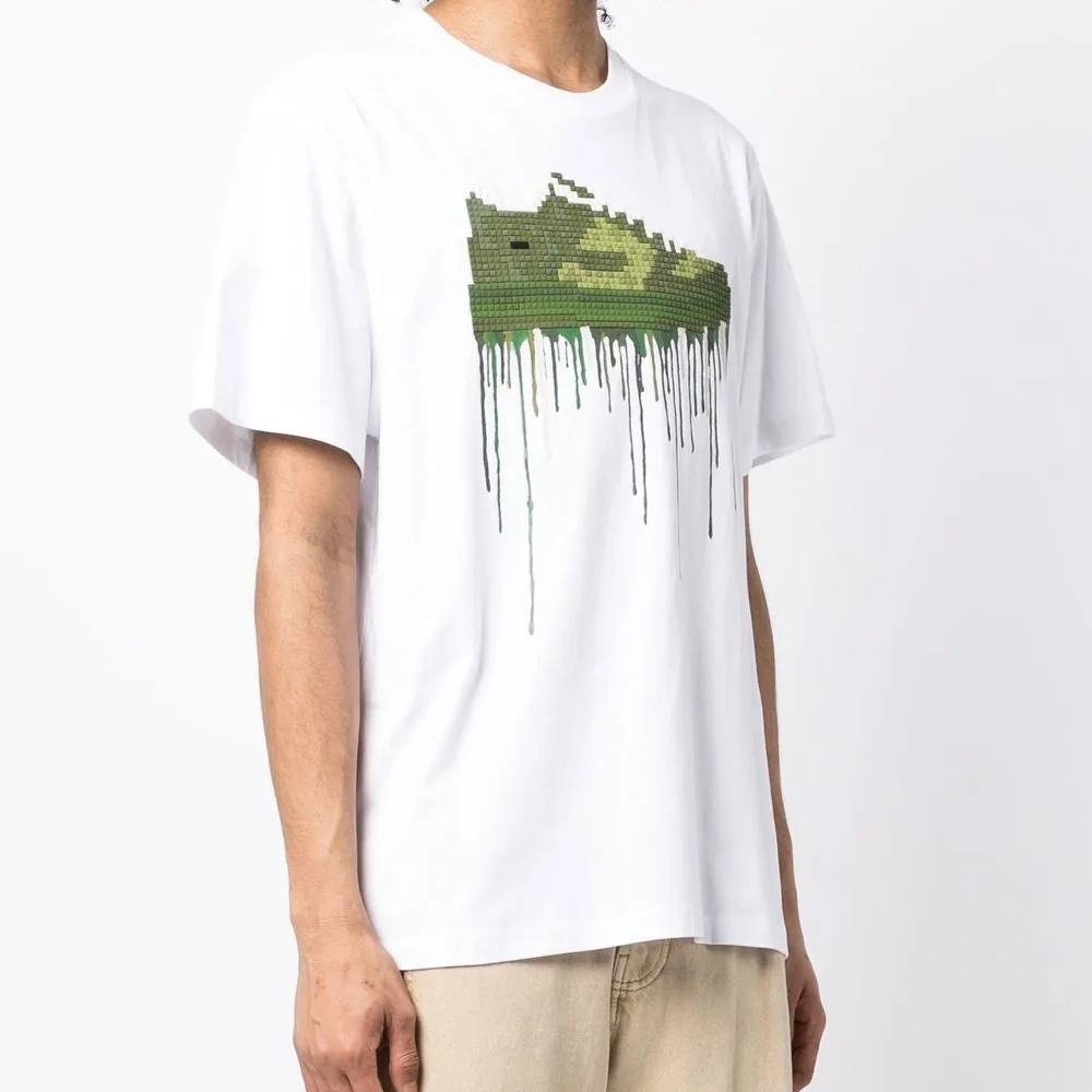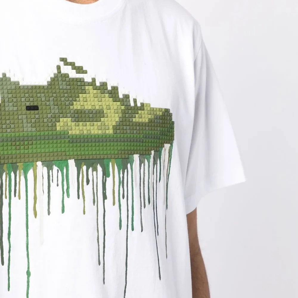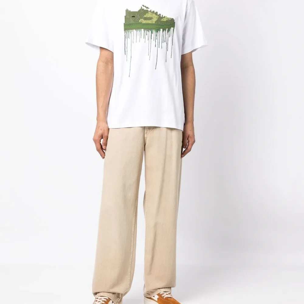 Хлопок, графичный принт спереди, круглый вырез, короткие рукава и прямой подол.