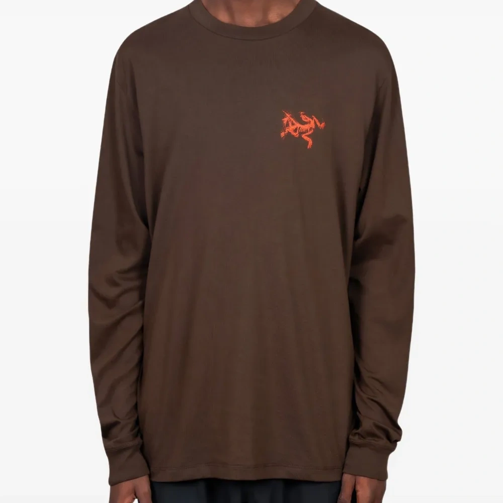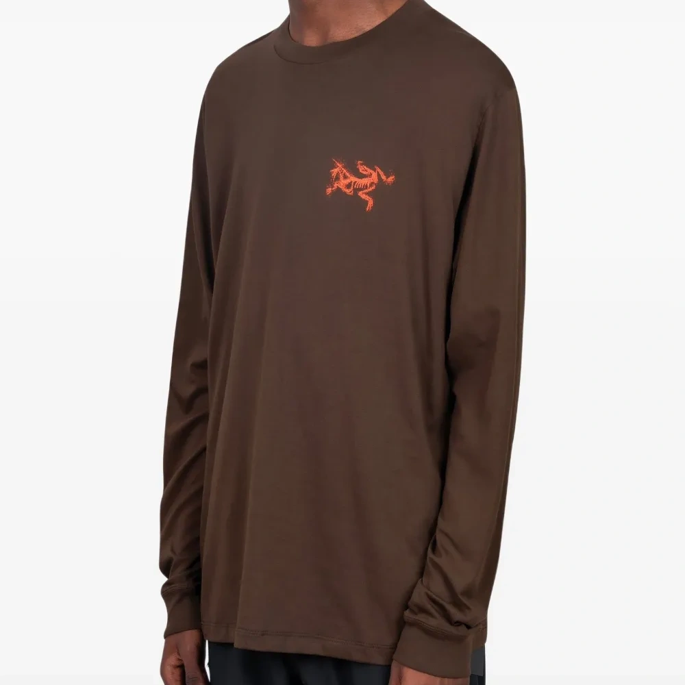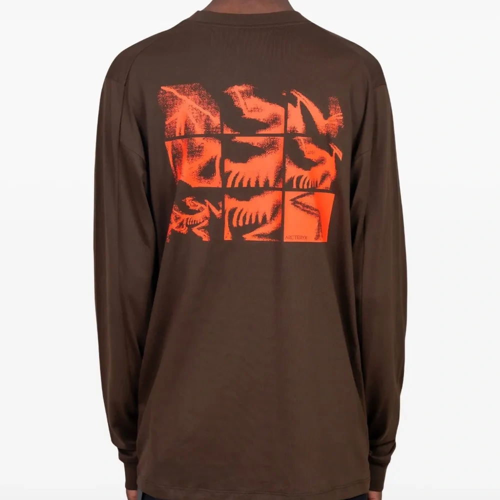 коричневый цвет, графический принт спереди, длинные рукава, круглый вырез, графический принт сзади, ровный край