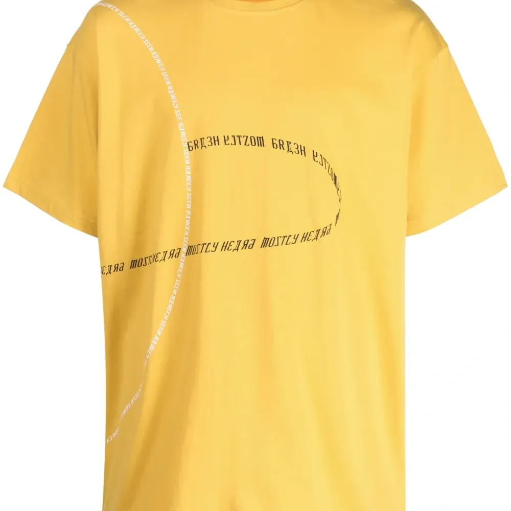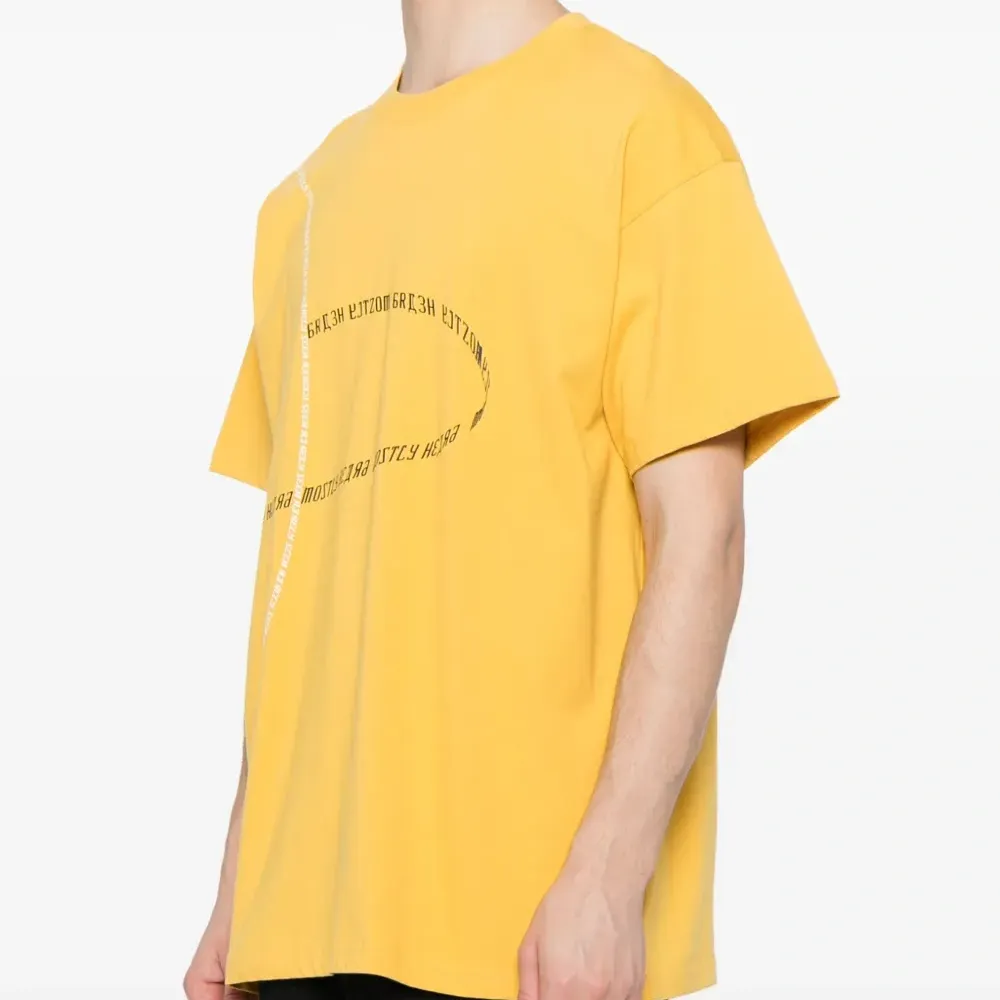 Ярко-желтый, хлопок, принт с надписью спереди, круглый вырез, приспущенные плечи, короткие рукава и прямой подол.