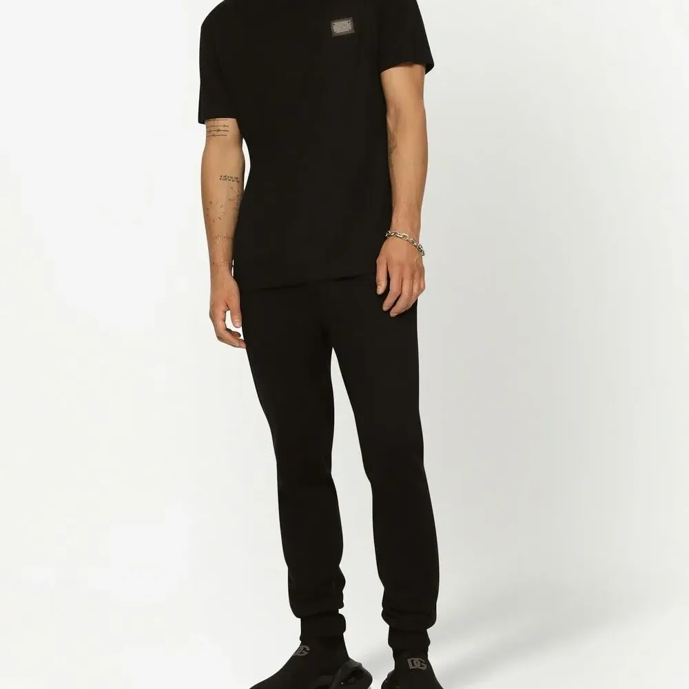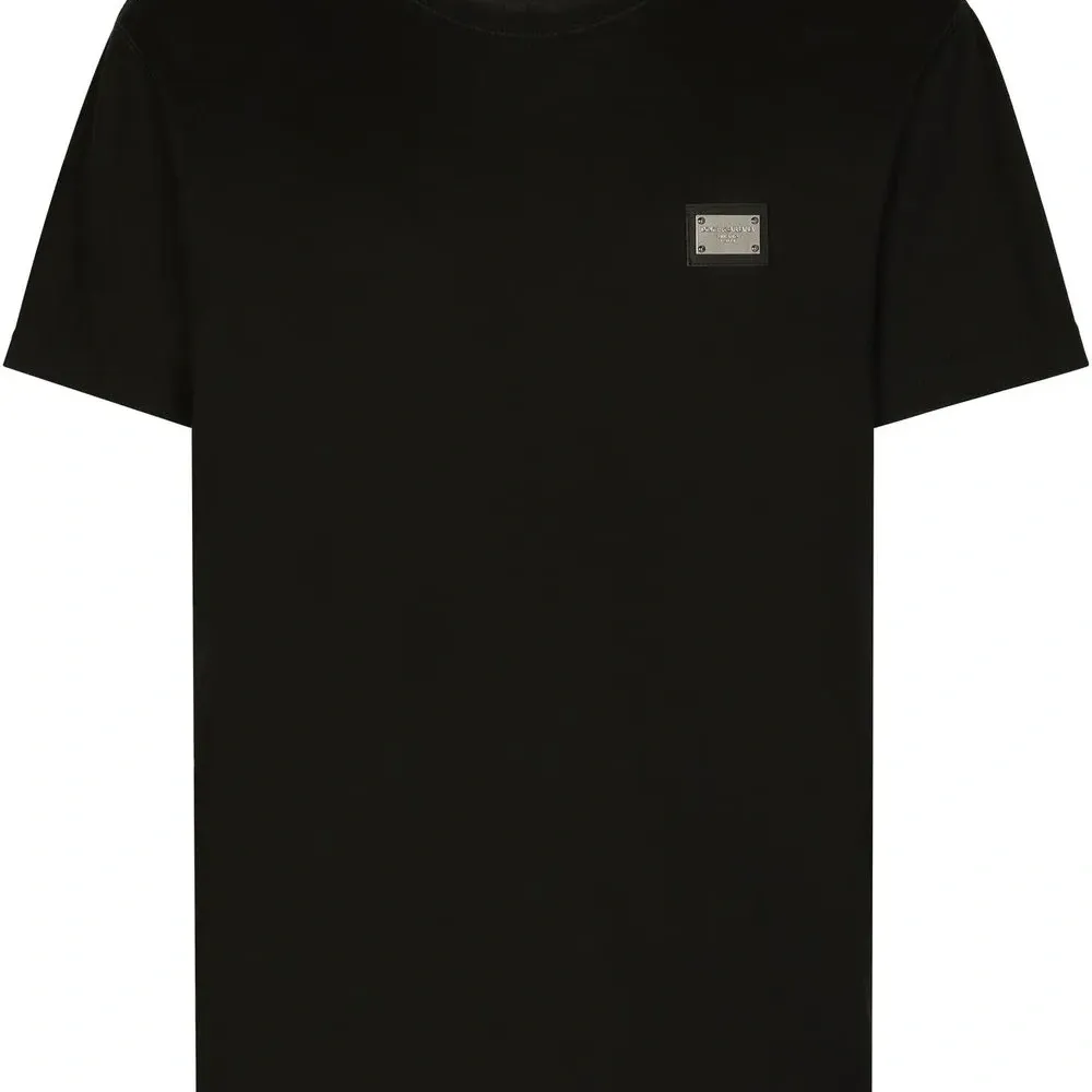 Черный, хлопок, серебристый металлический логотип, круглый вырез и короткие рукава.