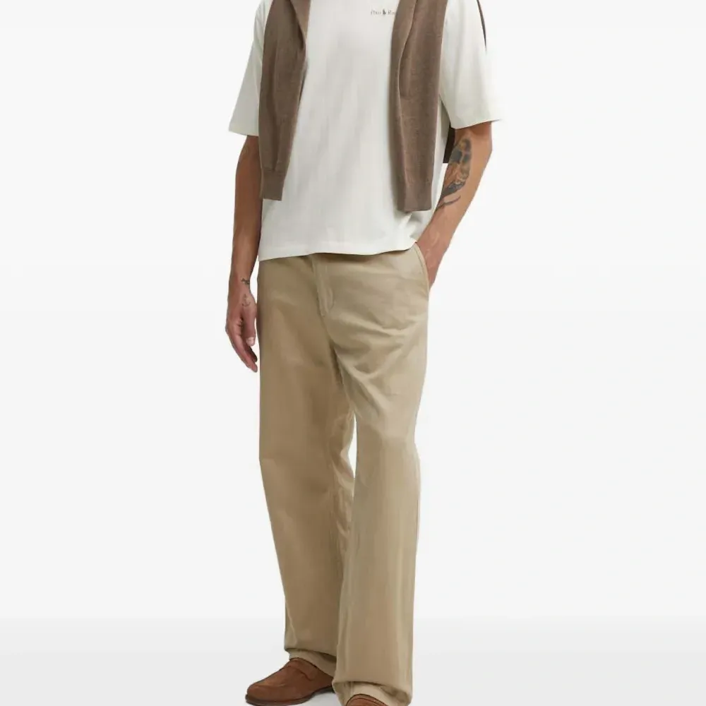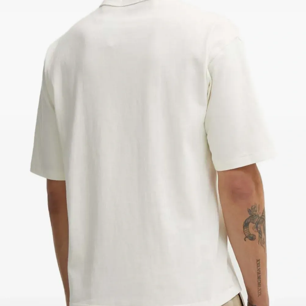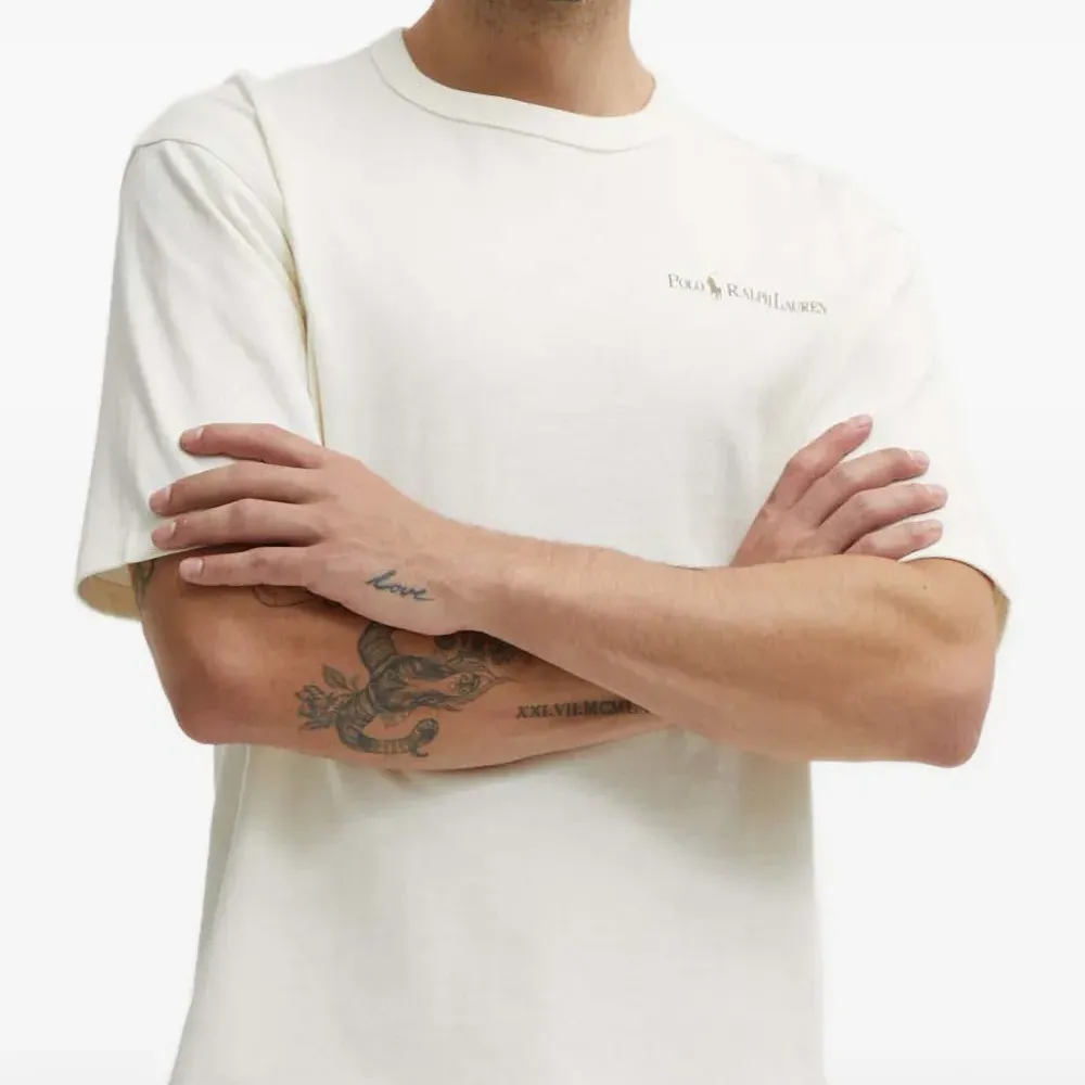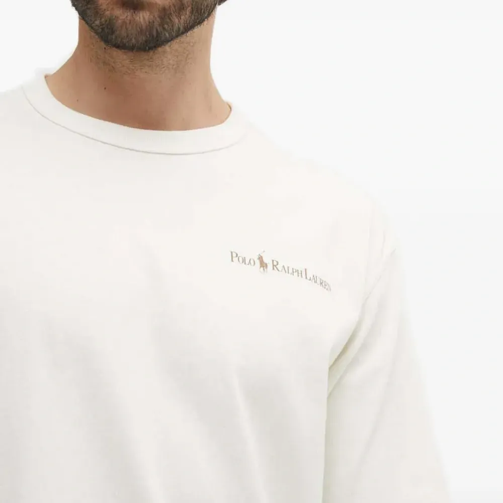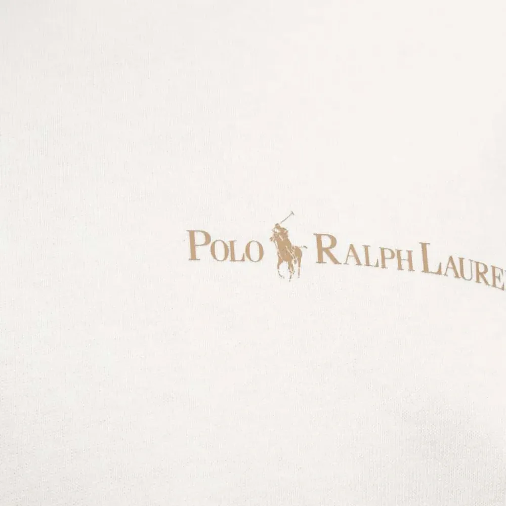 белая футболка с круглым вырезом, принтом логотипа и короткими рукавами