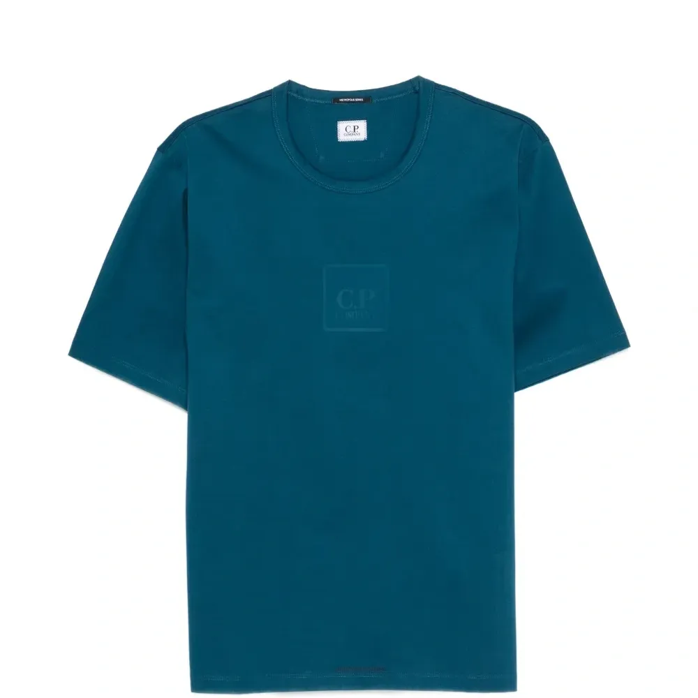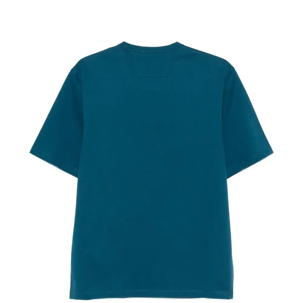 сине-зеленая футболка с круглым вырезом, короткими рукавами и однотонной отделкой с логотипом