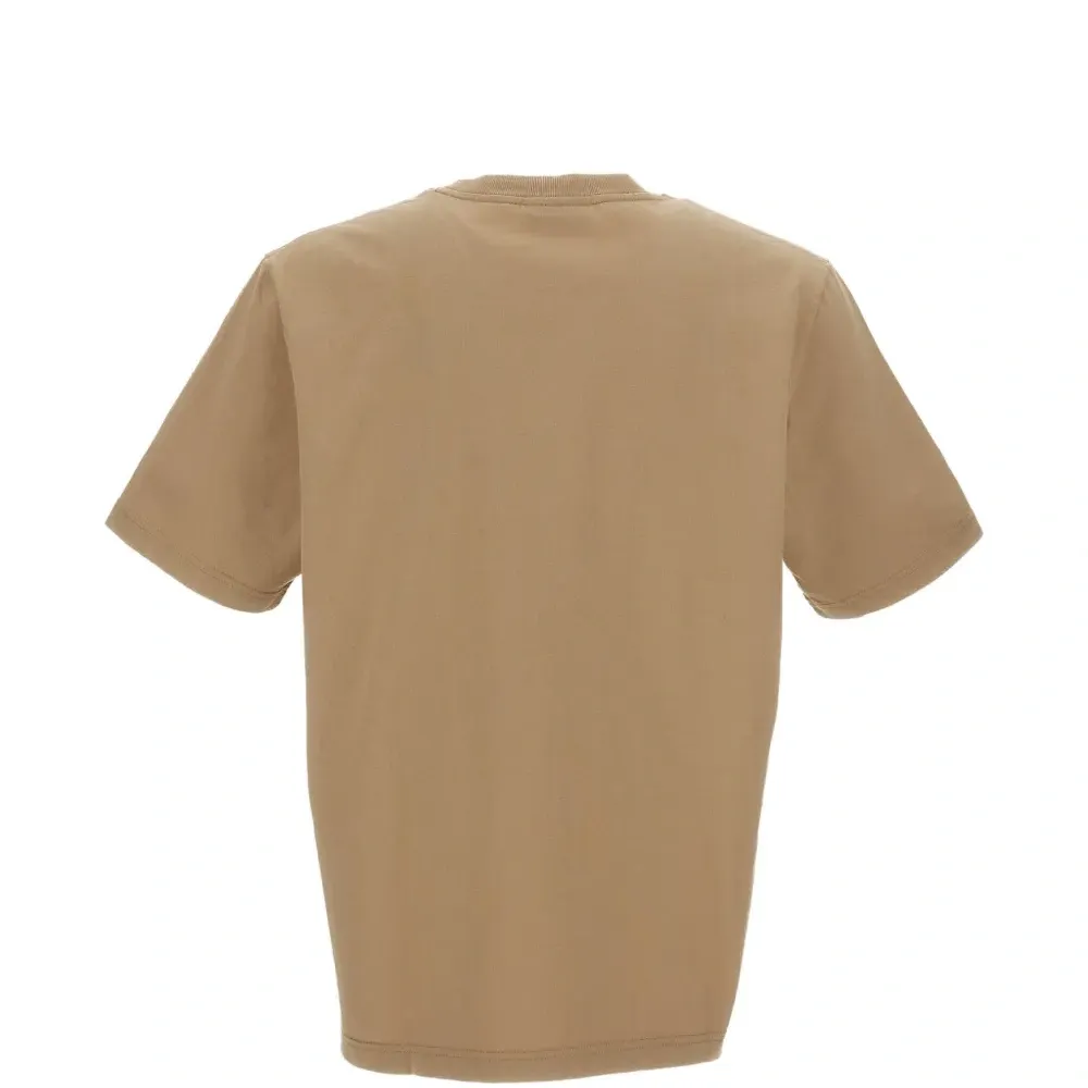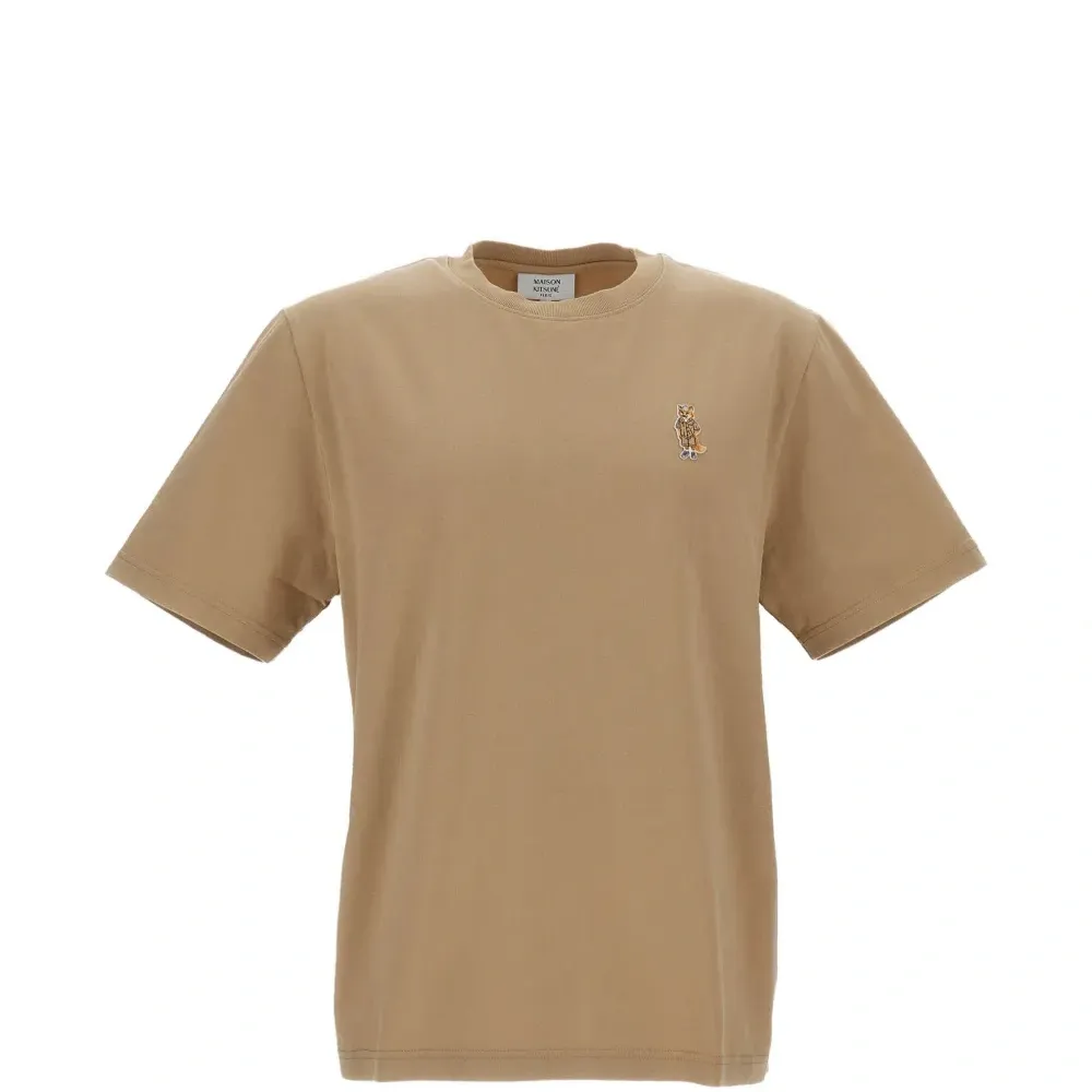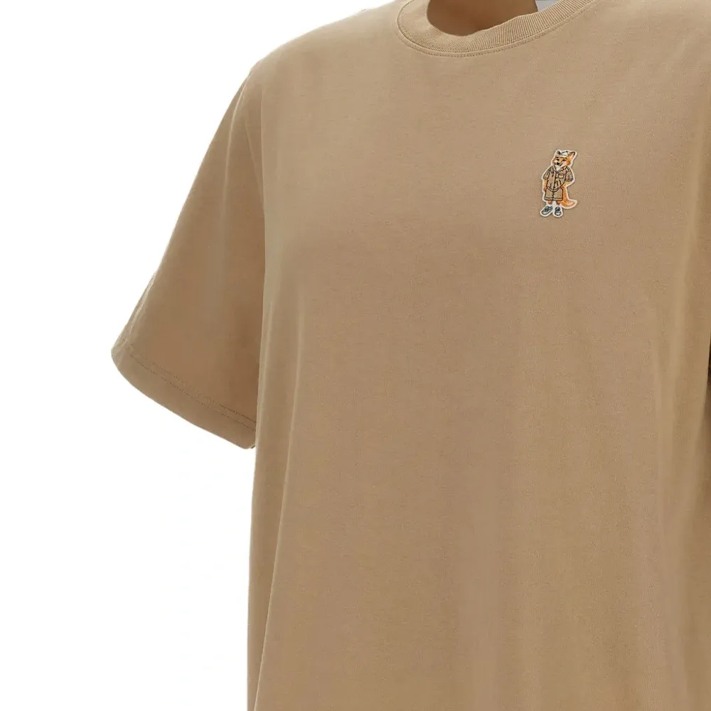 бежевая футболка с круглым вырезом, короткими рукавами и аппликацией