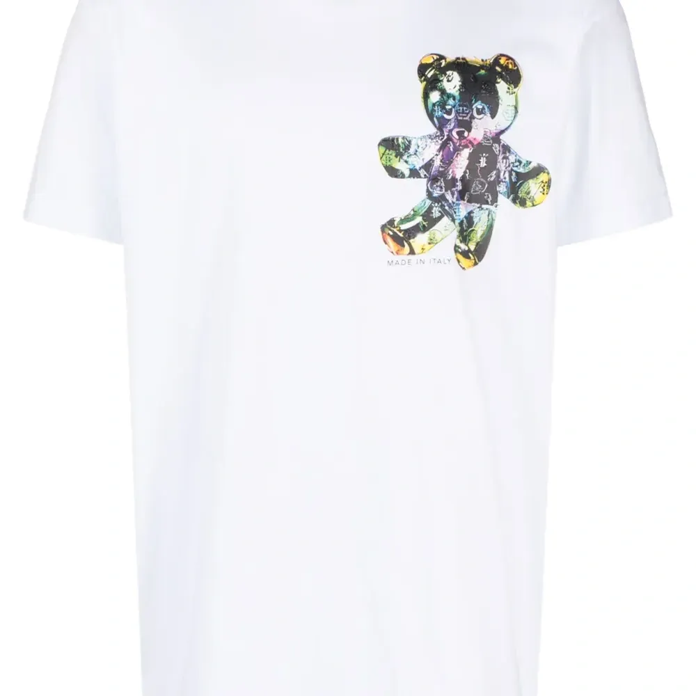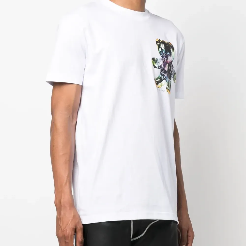 Белый, хлопок, ткань джерси, принт с изображением плюшевого медведя, нашивка с логотипом сзади, круглый вырез, короткие рукава и прямой подол.