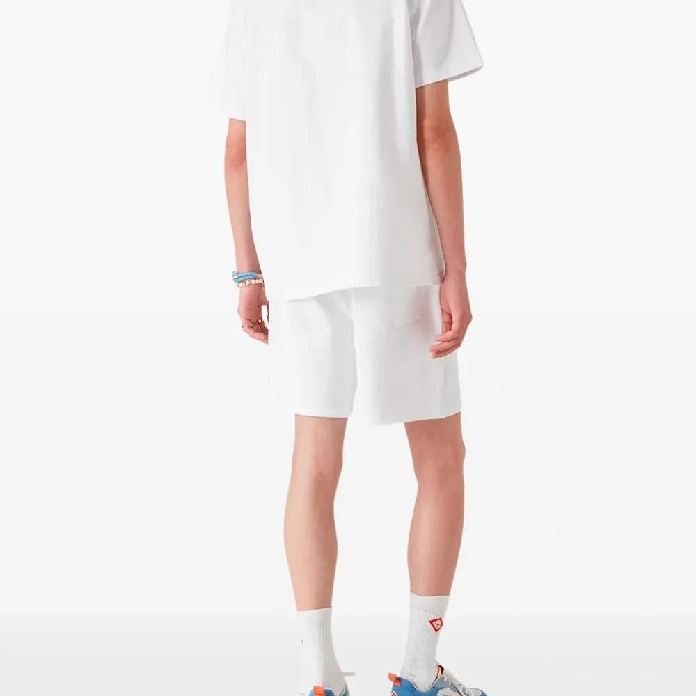 белый с графическим принтом, круглый вырез, ребристый воротник, короткие рукава, прямые манжеты