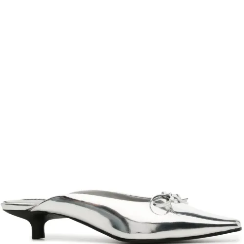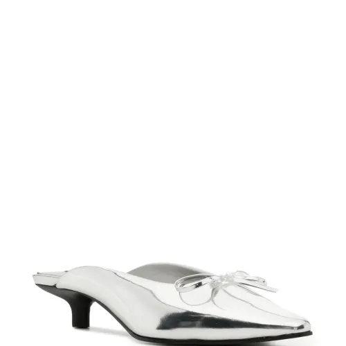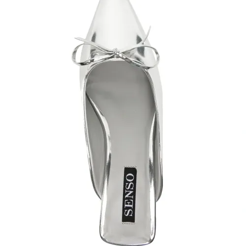 Серебро, кожа, лакированная отделка, модель без застежки, бант, заостренный носок, кожаная стелька с логотипом и каблук-рюмка.