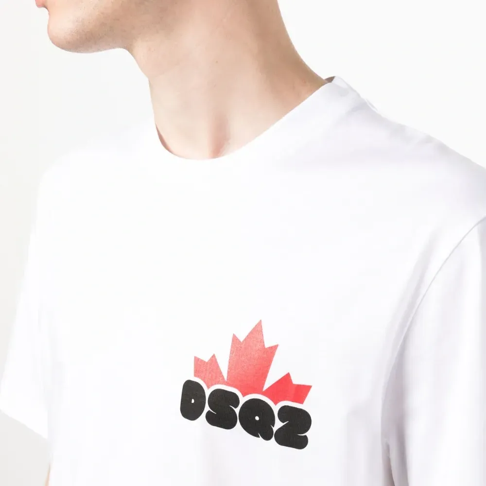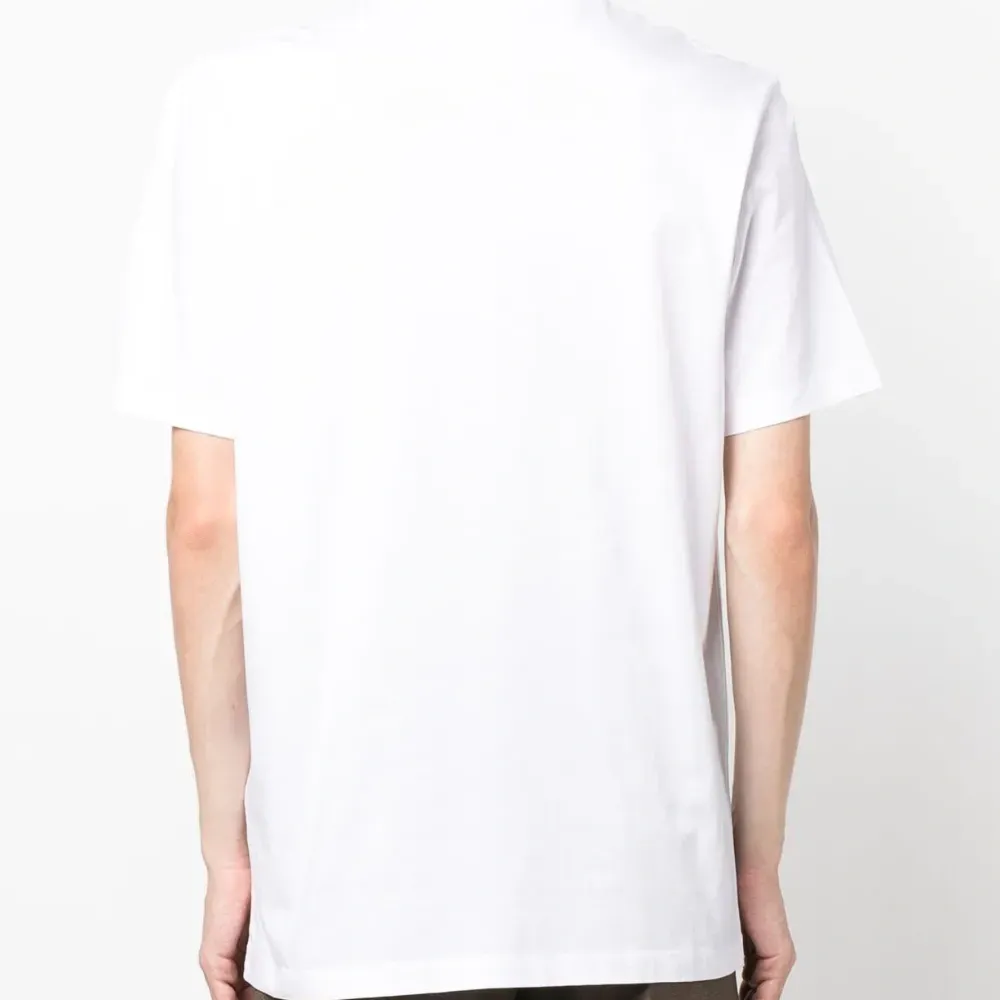 Белый, хлопок, принт с логотипом на груди, воротник-стойка в рубчик, короткие рукава и прямой подол.