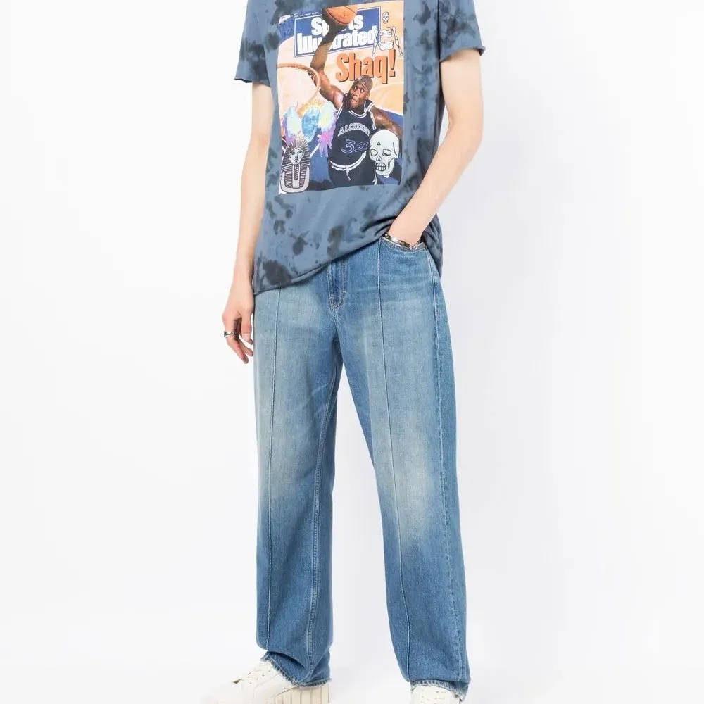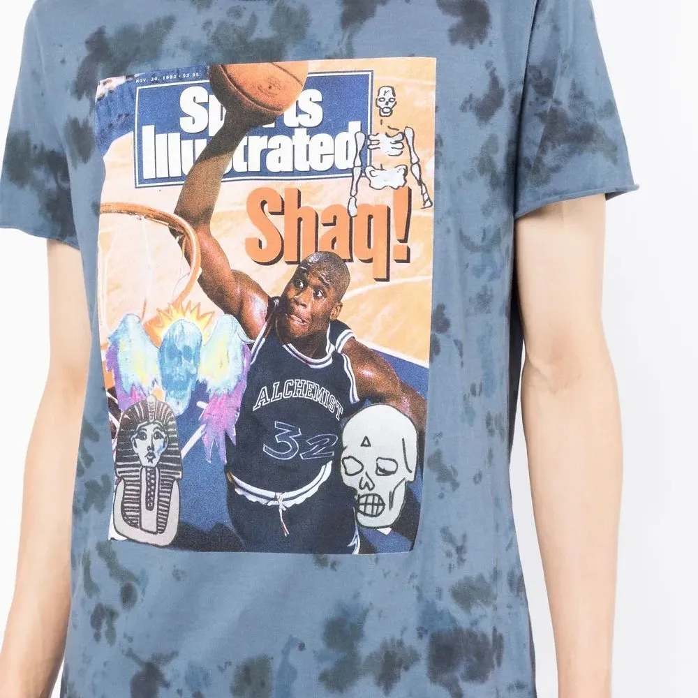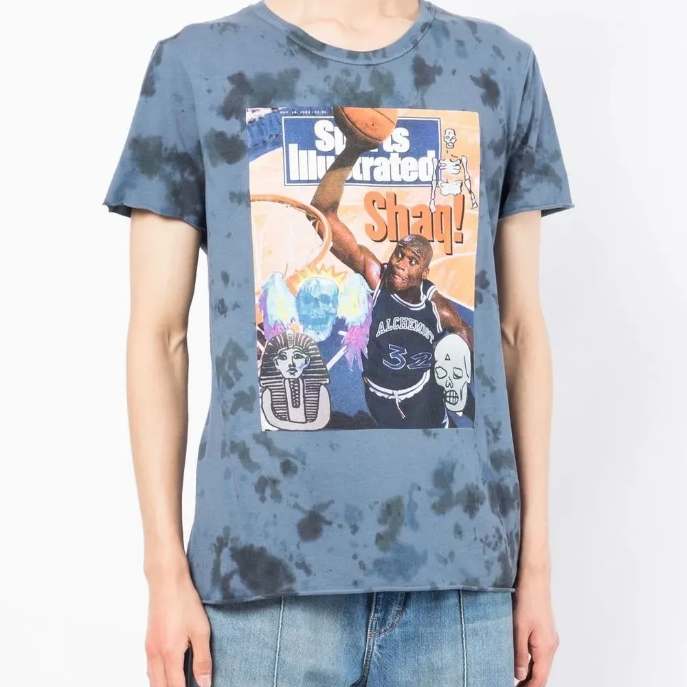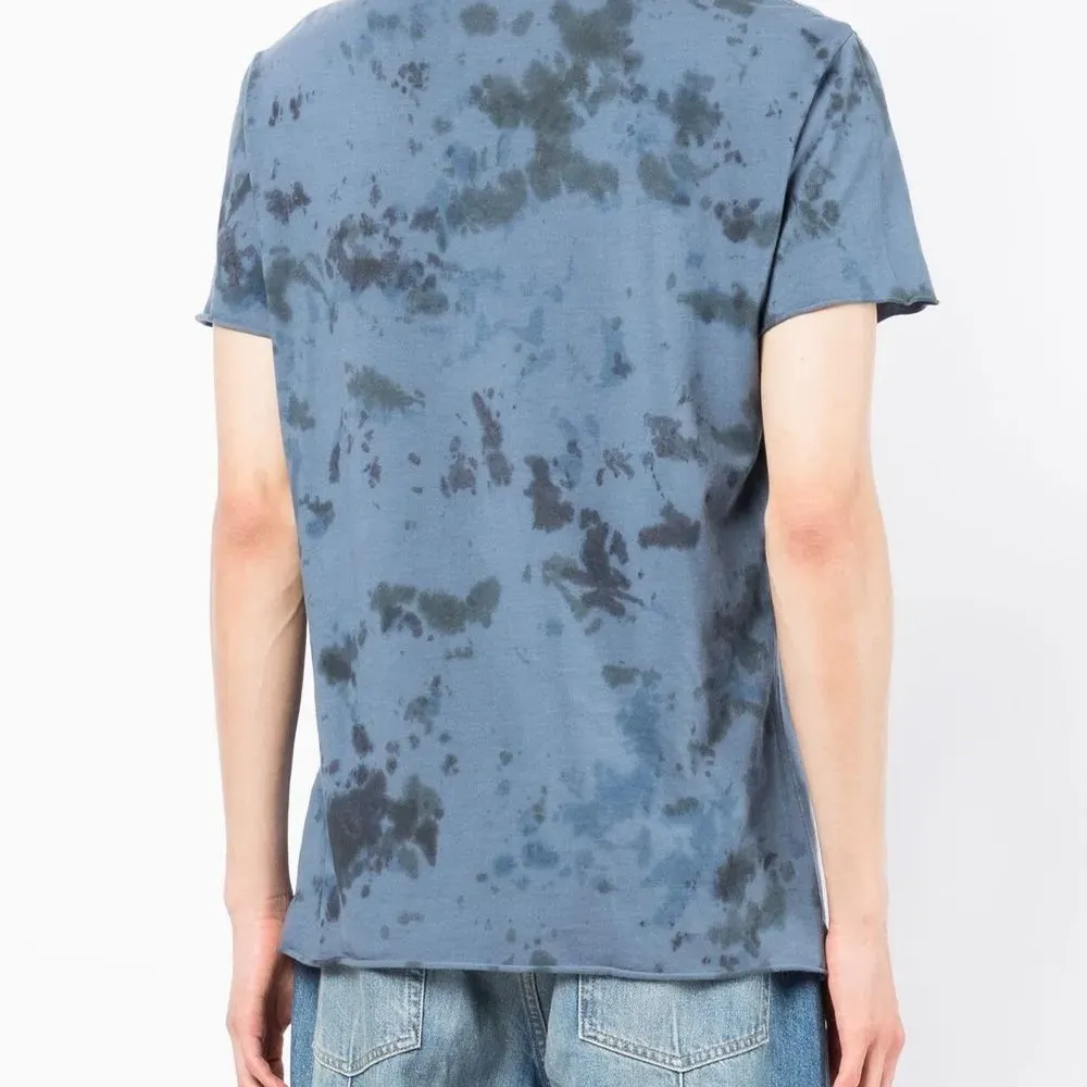 Индиго, хлопок, принт тай-дай, графичный принт спереди, круглый вырез, короткие рукава и прямой подол. Узнать больше о том, какие товары получают отметку «Ответственный выбор», можно из материала «Как мы оцениваем экологичность и этичность».