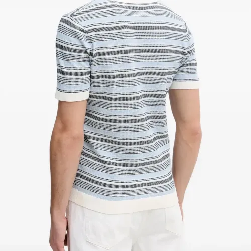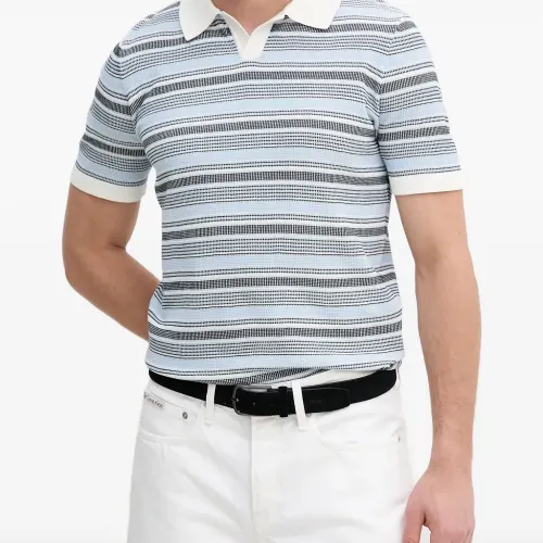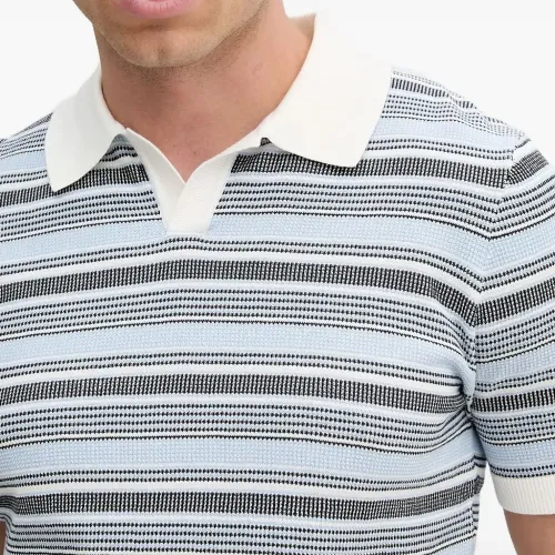 светло-голубые горизонтальные полосы, вязаная текстура, короткие рукава, отложной воротник