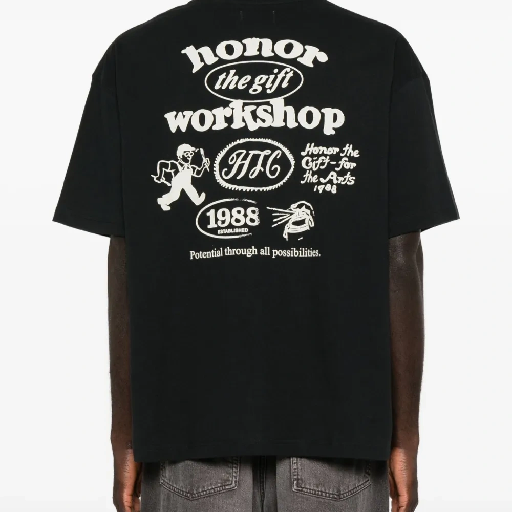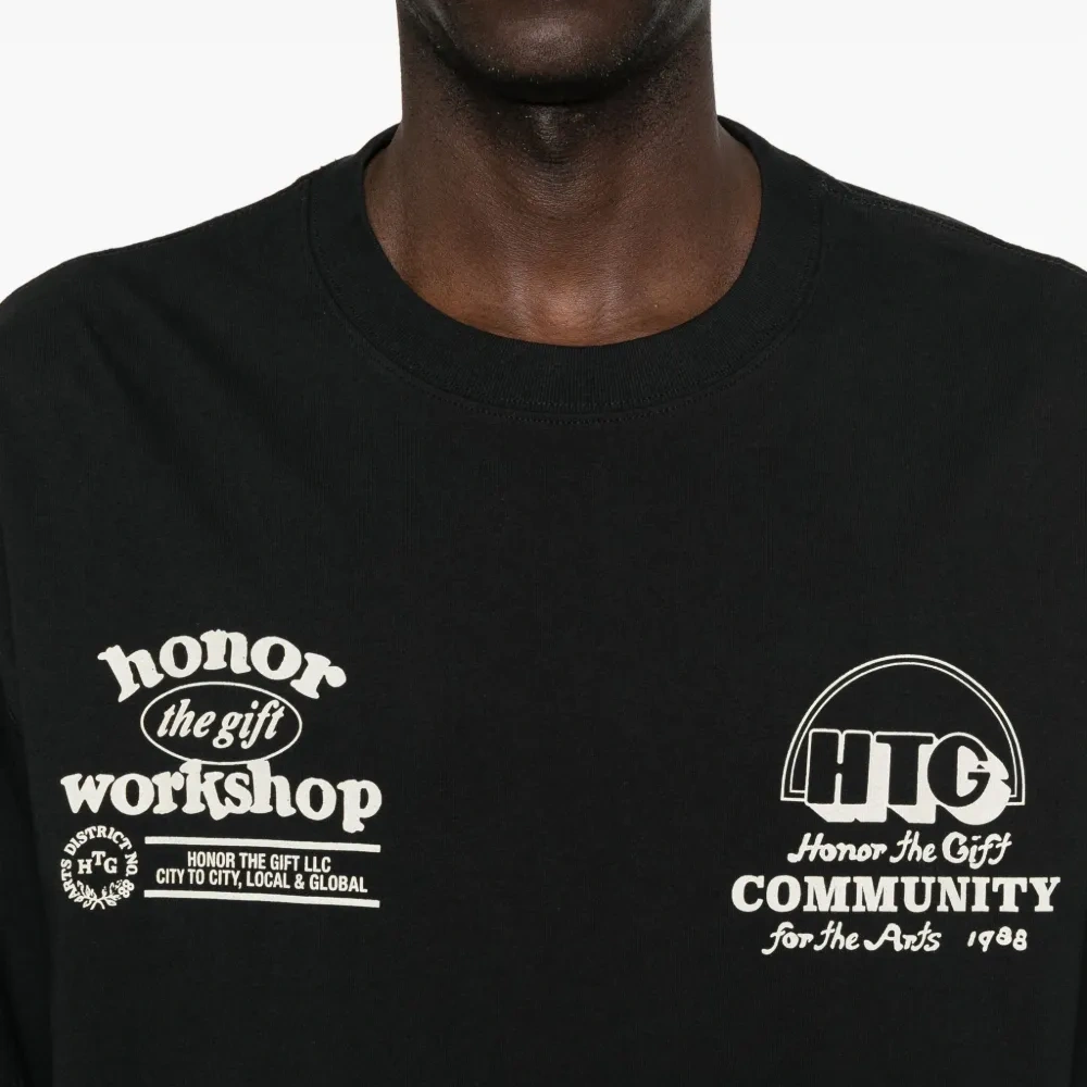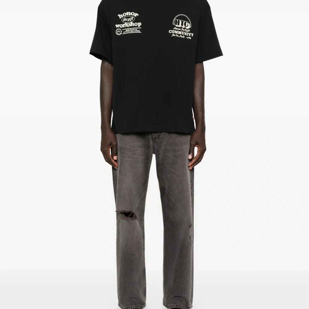 черная футболка с круглым вырезом, короткими рукавами, графическим принтом, принтом-текстом и прямым подолом