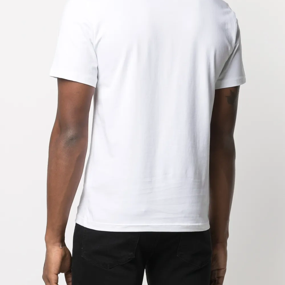Принт с логотипом на груди, круглый вырез, короткие рукава и прямой подол.