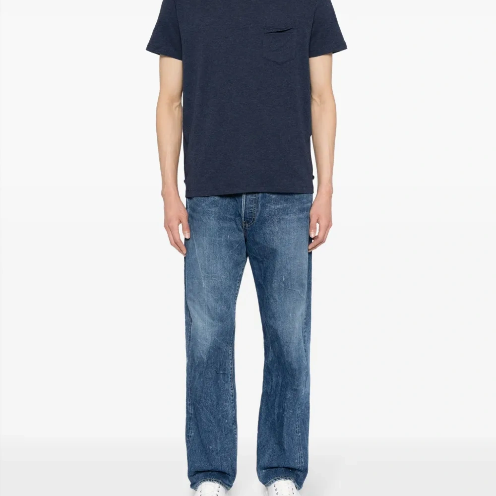 Темно-синий, смесь хлопка и кашемира, эффект меланж, круглый вырез, короткие рукава, нагрудный накладной карман и прямой подол.