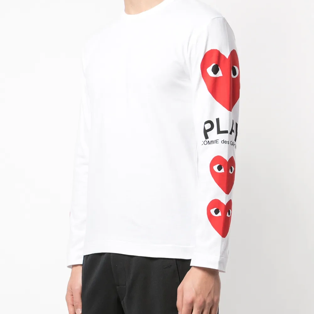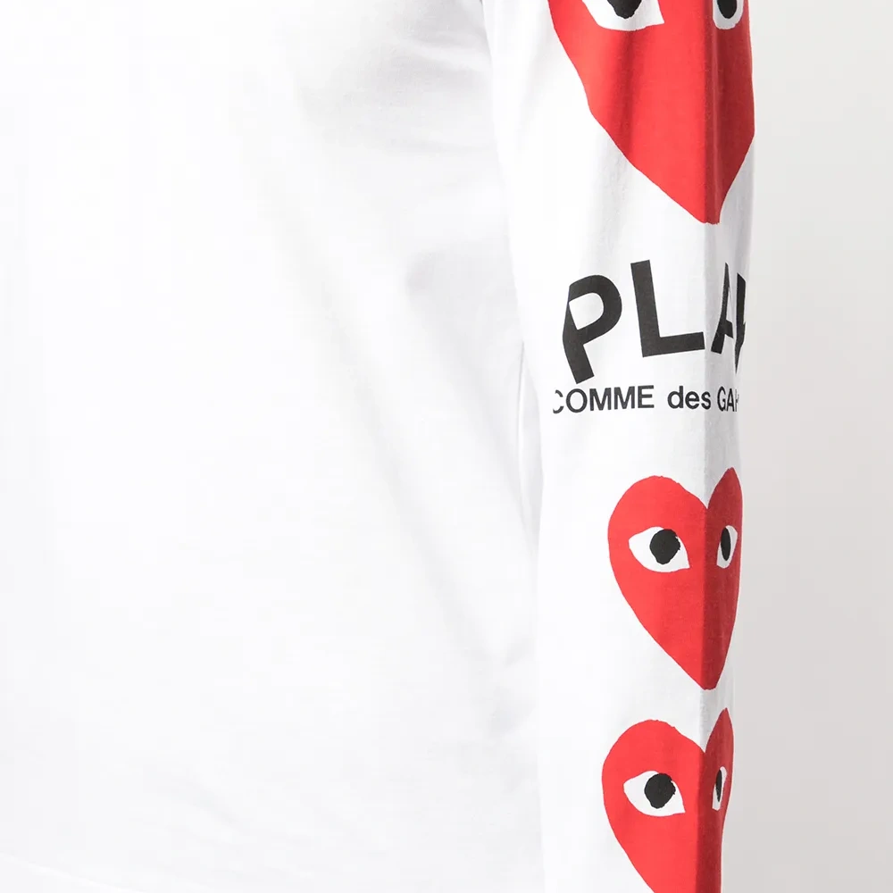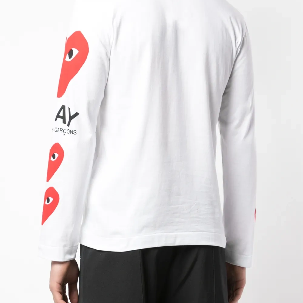Футболка с принтом на рукавах от Comme des Garçons Play. Круглый вырез под горло, длинные рукава, прямой подол и логотип на левом рукаве. Цвет: белый.