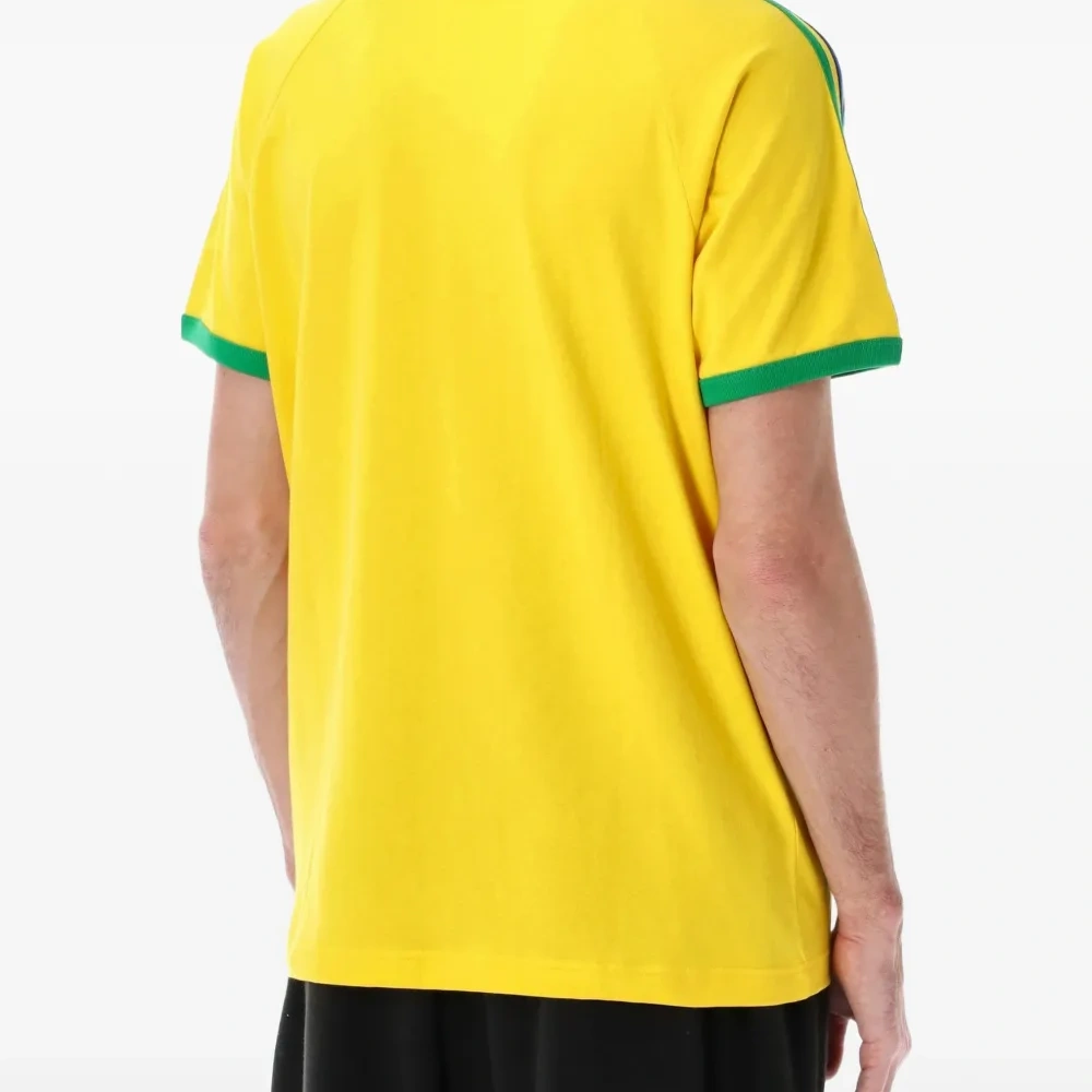 жёлтая футболка с тремя полосками, круглым вырезом, логотипом, короткими рукавами и трикотажной отделкой