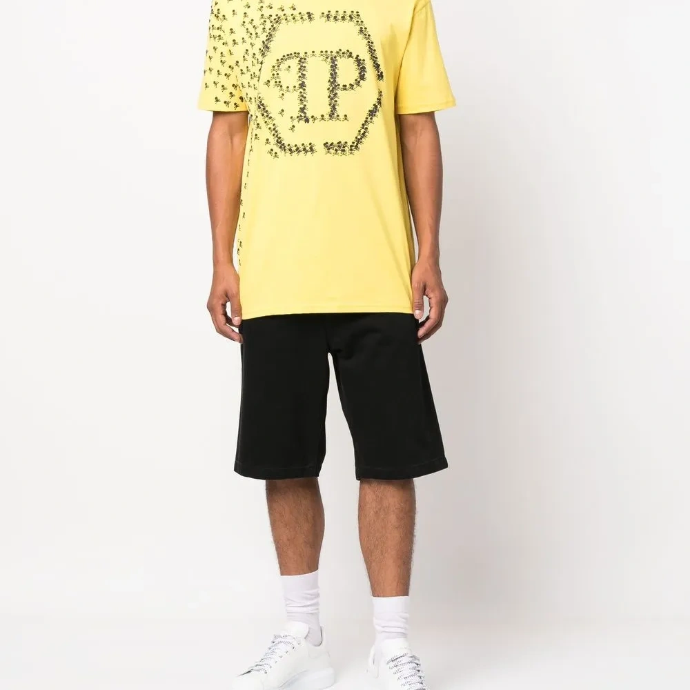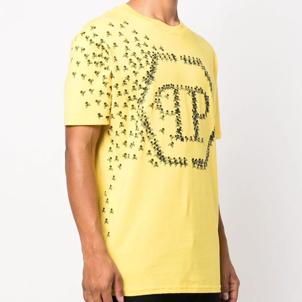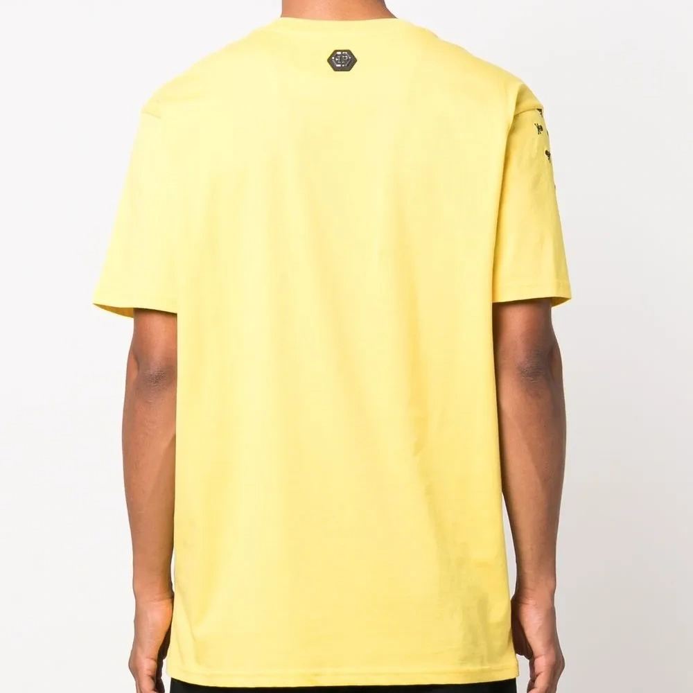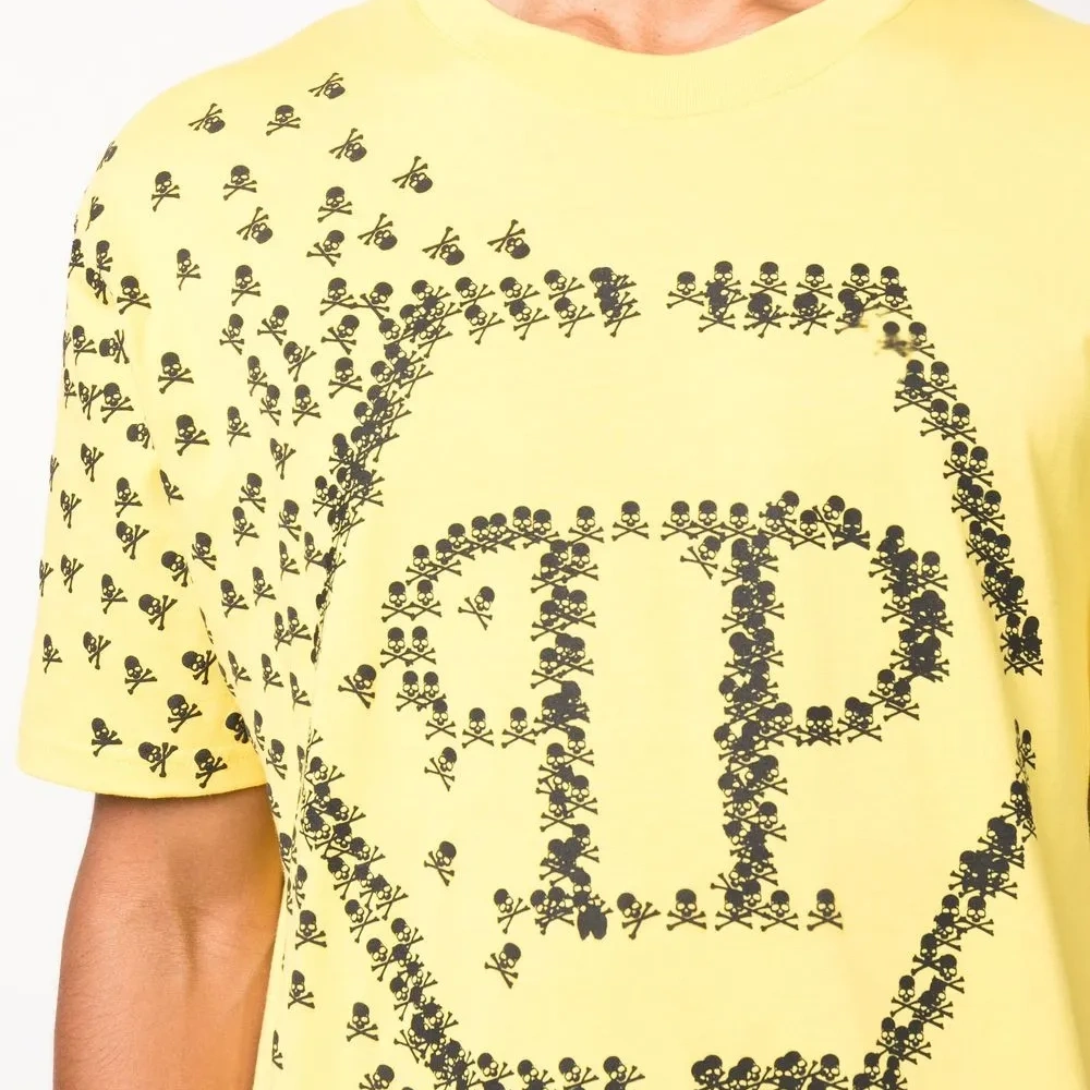 Желтый, черный, хлопок, ткань джерси, принт с изображением черепа спереди, логотип спереди, нашивка с логотипом сзади, круглый вырез, короткие рукава и прямой подол.