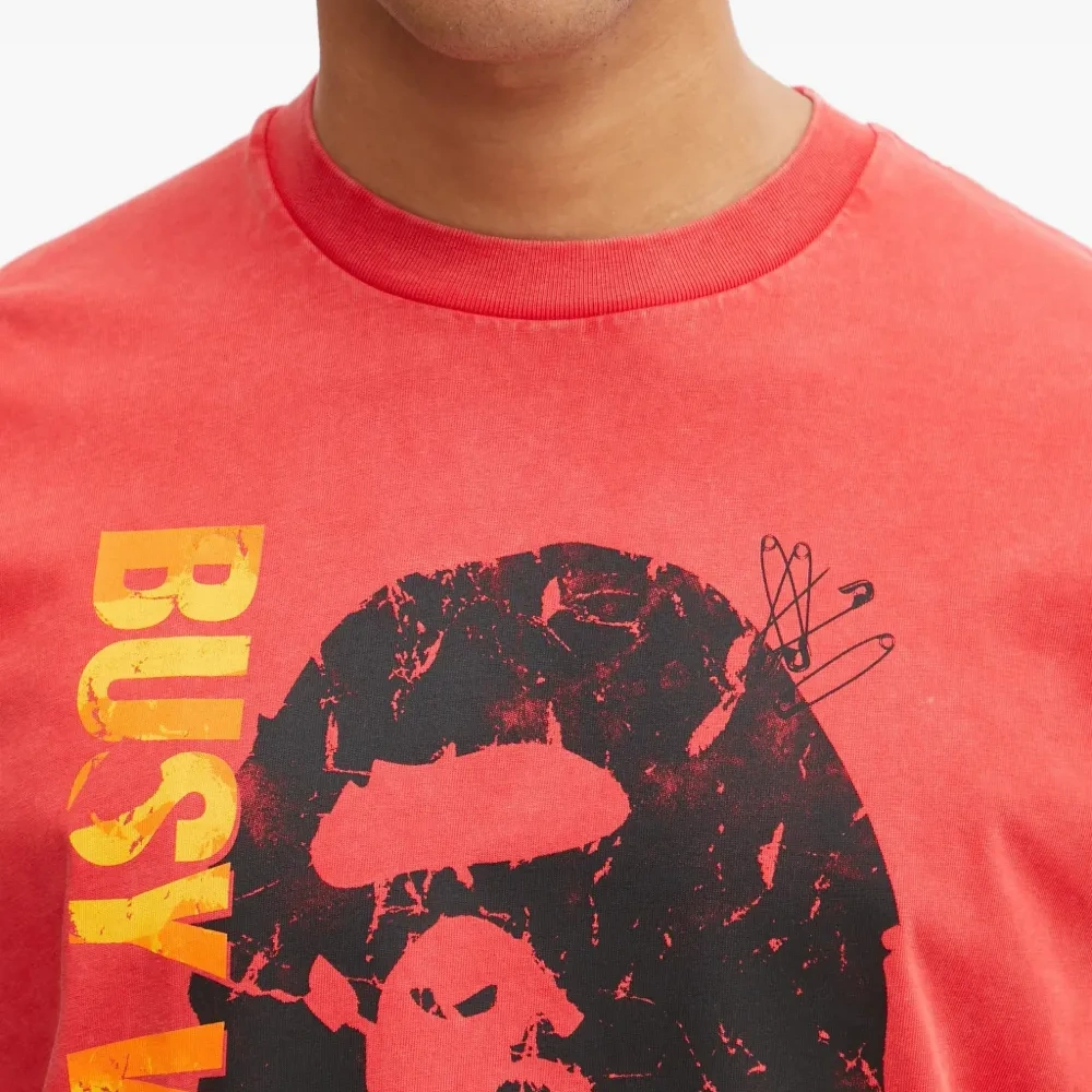 красная футболка с принтом спереди, круглым вырезом и короткими рукавами