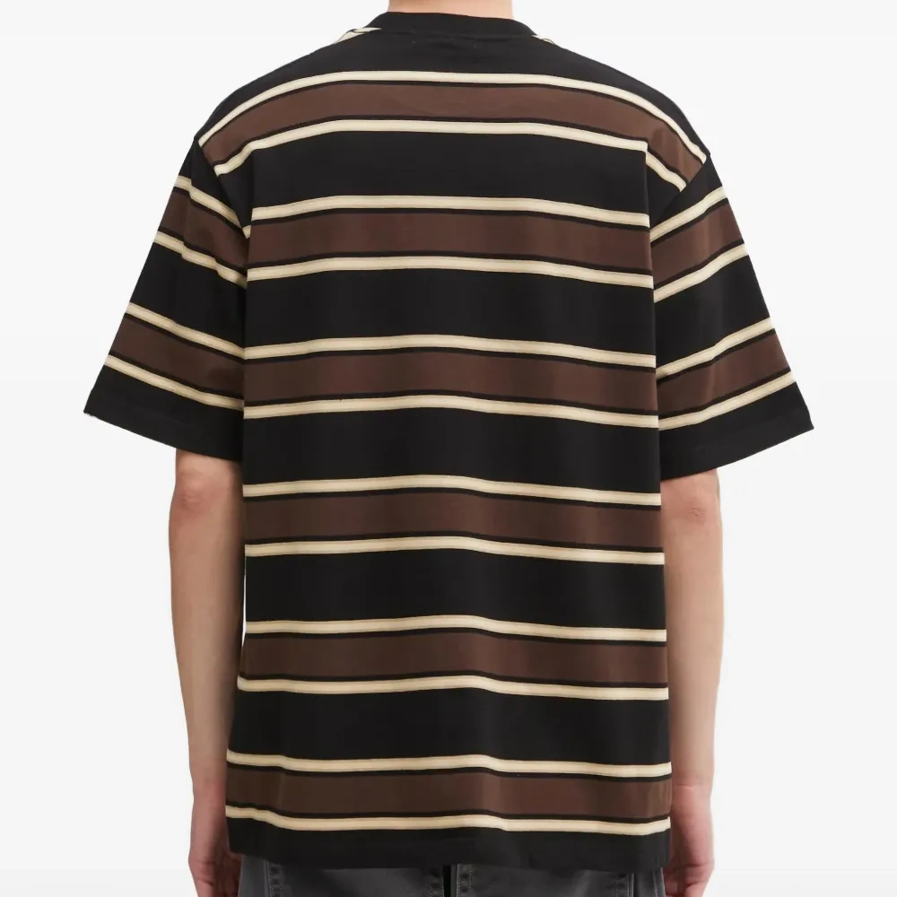 чёрная и коричневая футболка в полоску с нашивкой-логотипом, круглым вырезом и короткими рукавами