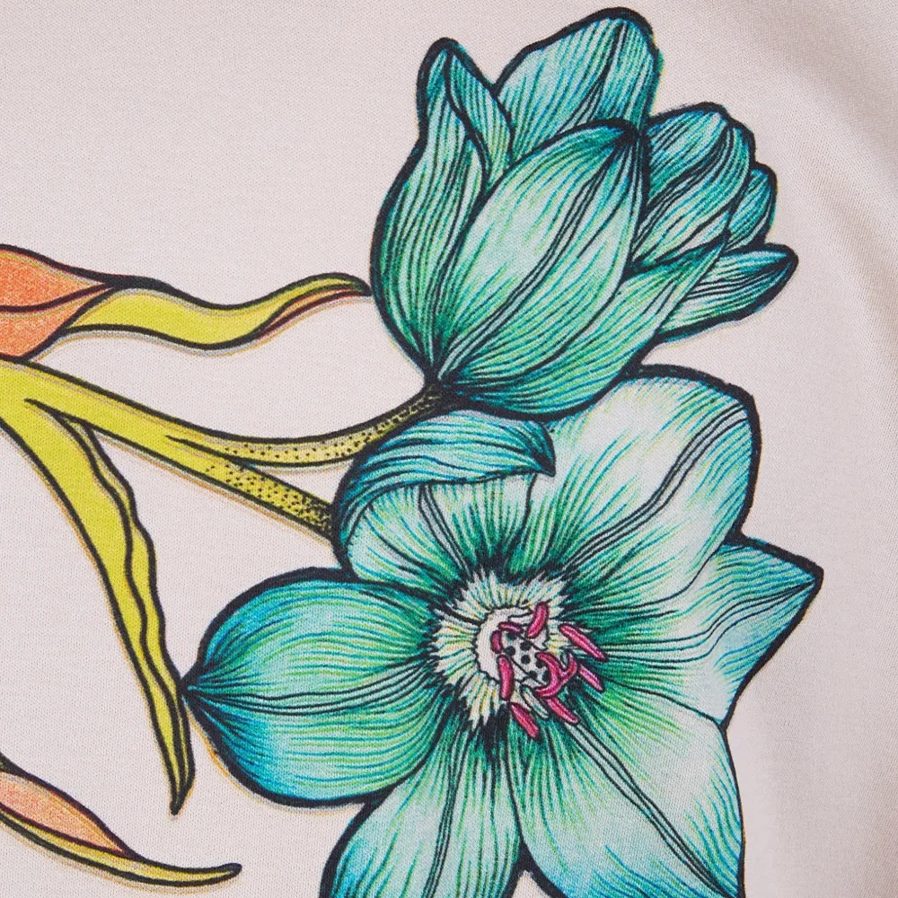 бежевый футболка с цветочным принтом, круглым вырезом и короткими рукавами