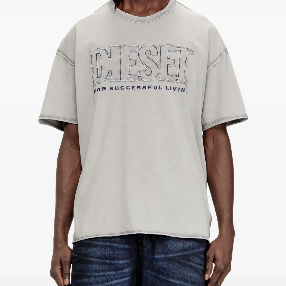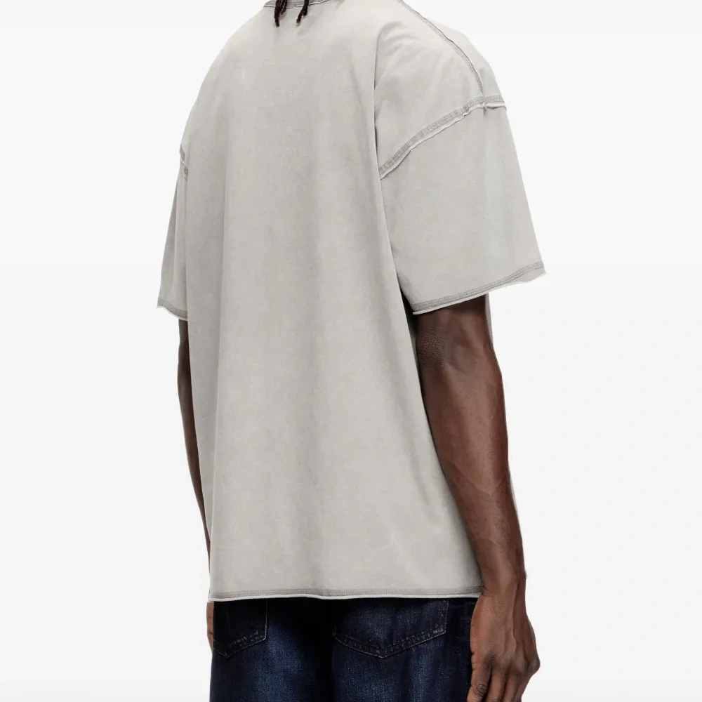 светло-серый, вышивка текстом, необработанные края, короткие рукава, круглый вырез