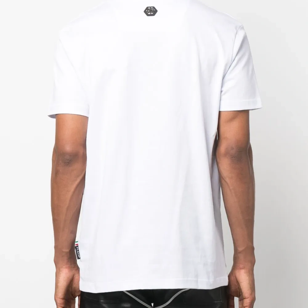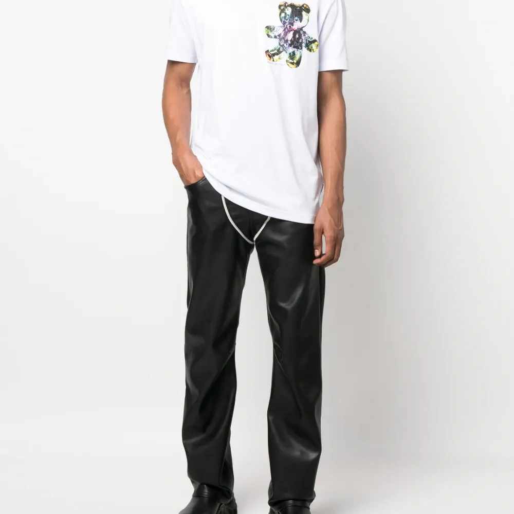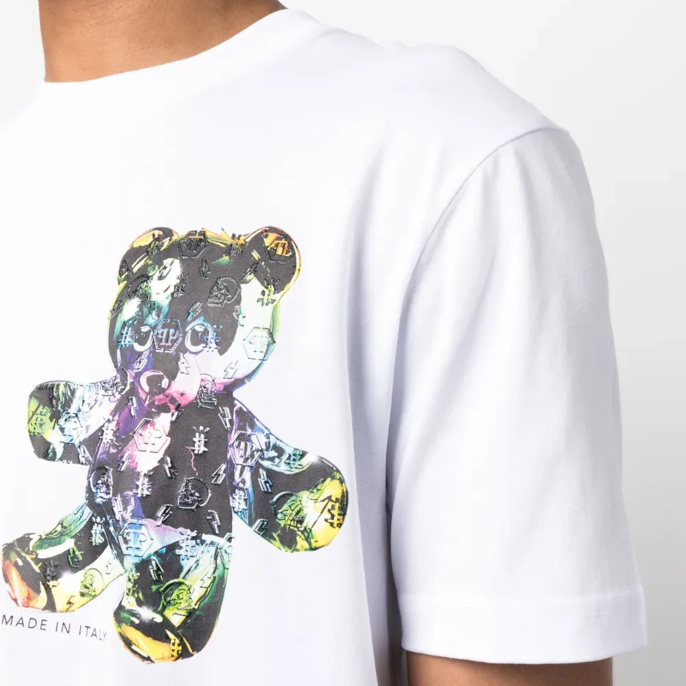 Белый, хлопок, ткань джерси, принт с изображением плюшевого медведя, нашивка с логотипом сзади, круглый вырез, короткие рукава и прямой подол.
