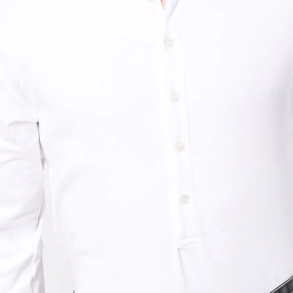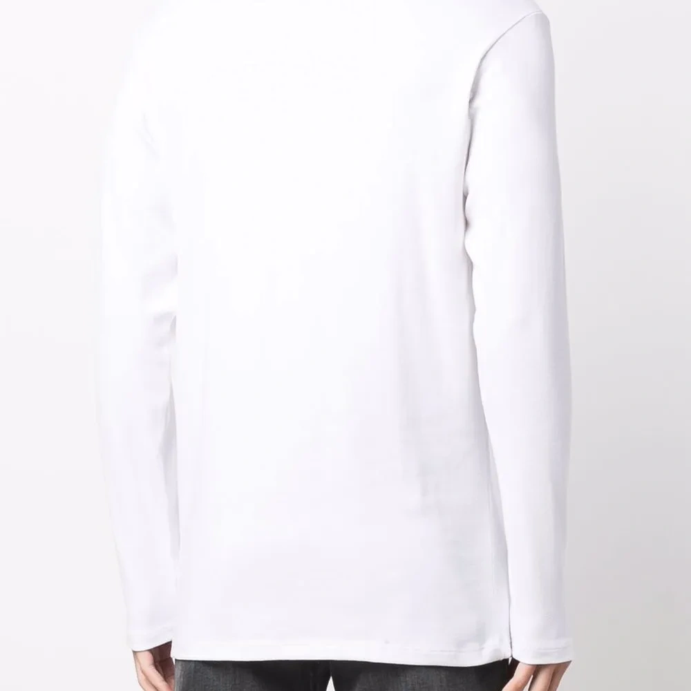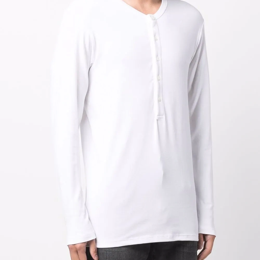 Ткань джерси, вырез хенли, планка на пуговицах спереди, длинные рукава и прямой подол. Цвет: белый.