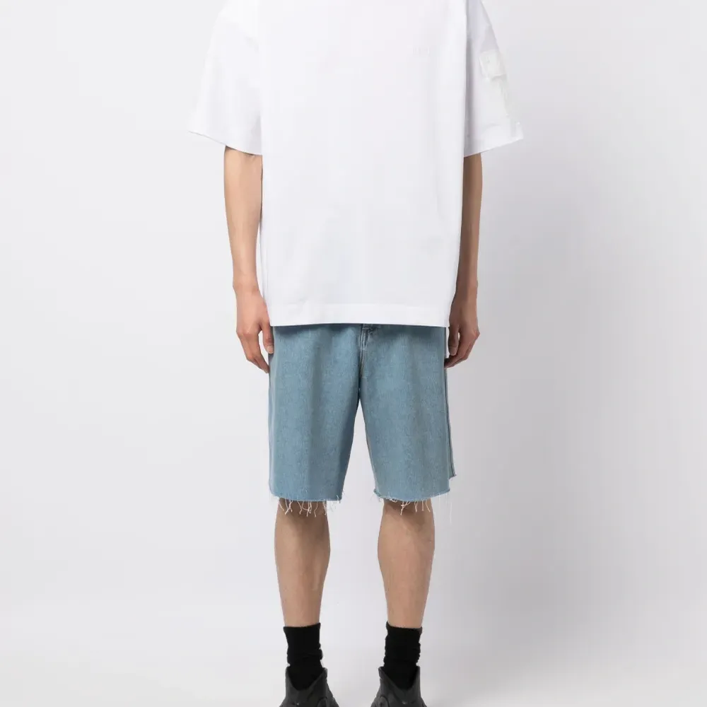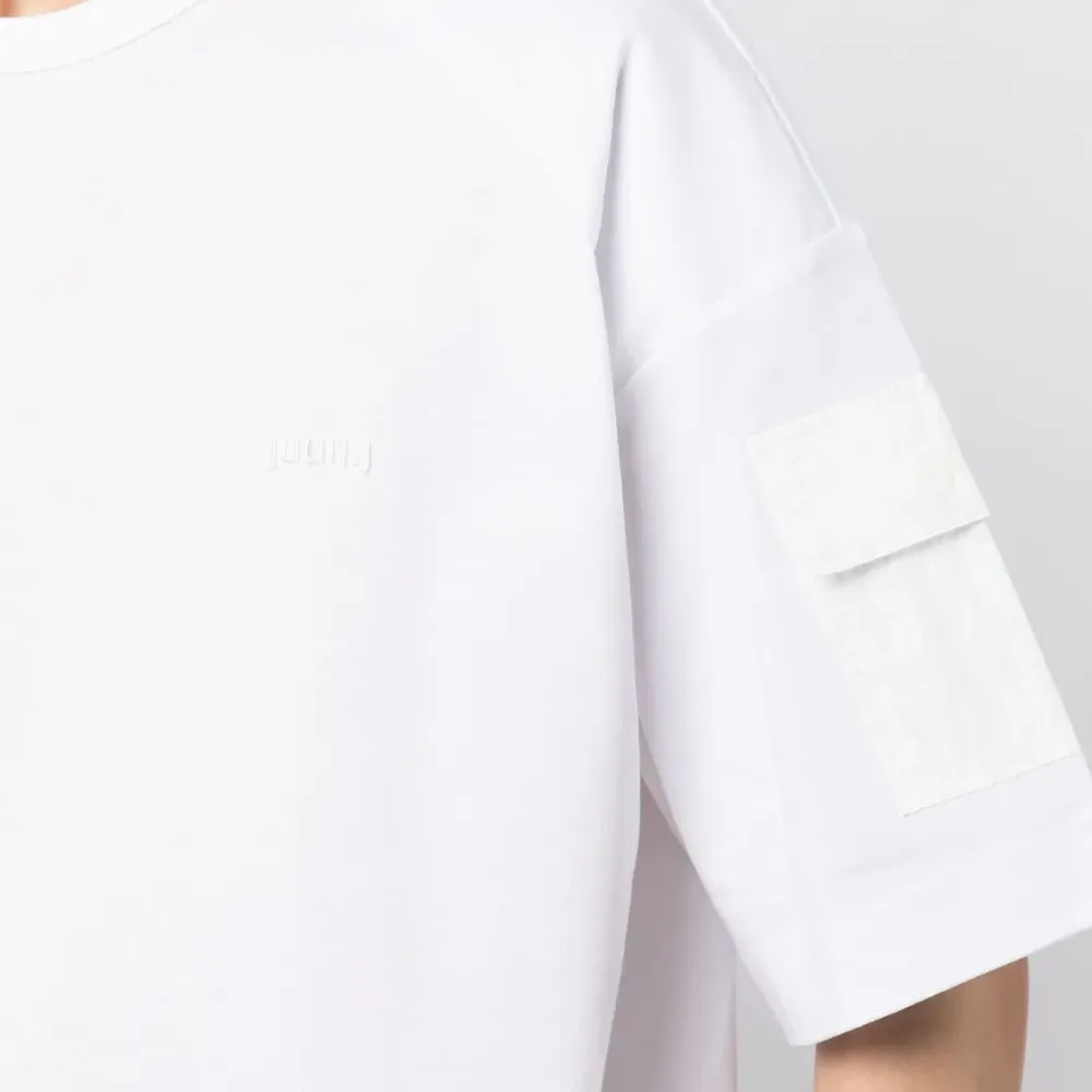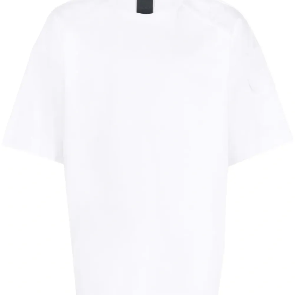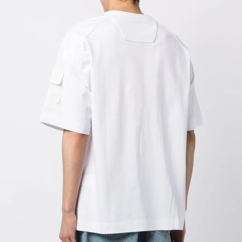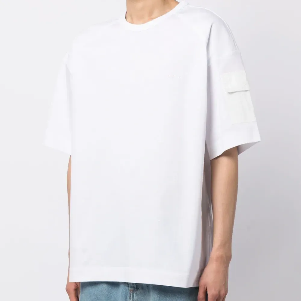 Белый, хлопок, круглый вырез, короткие рукава и карман с клапаном на рукаве.