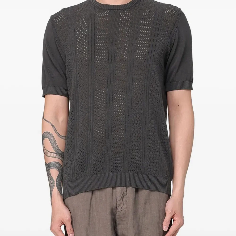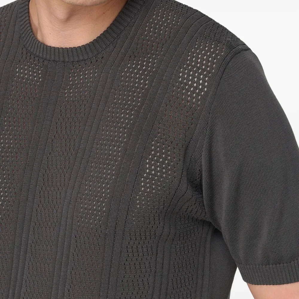 серый цвет, ажурный дизайн, короткие рукава, ребристый низ, ребристый круглый вырез, ребристые манжеты